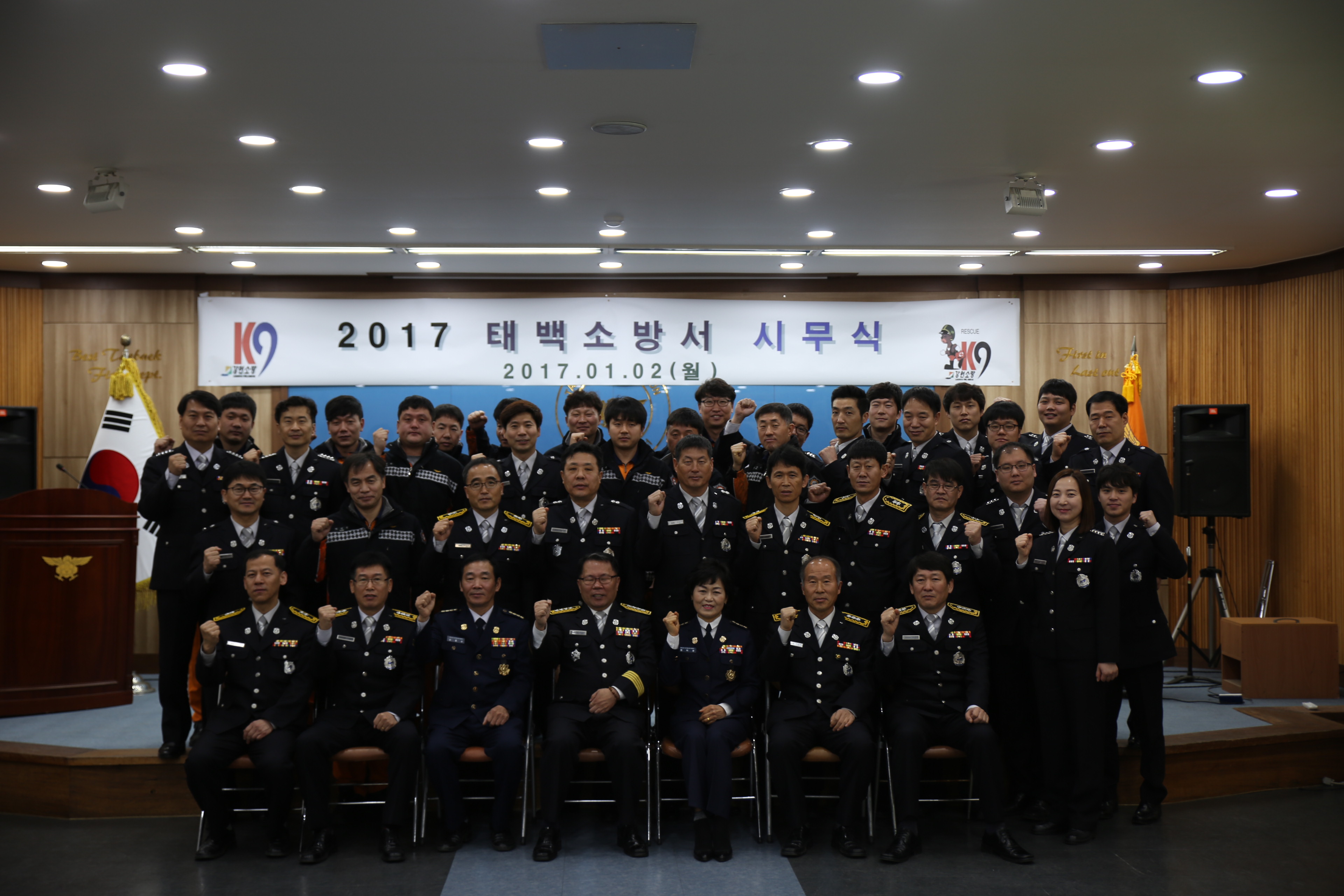 백소방서(서장 석교준)는 2일 10시 대회의실에서 직원 80여명이 참석한 가운데 정유년 새해 설계 및 새로운 각오와 결의를 다지는 시무식 행사를 개최했다.