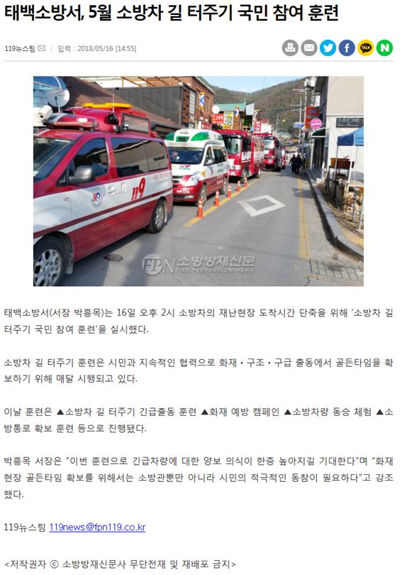 태백소방서, 소방차 길 터주기 국민참여 훈련 실시
