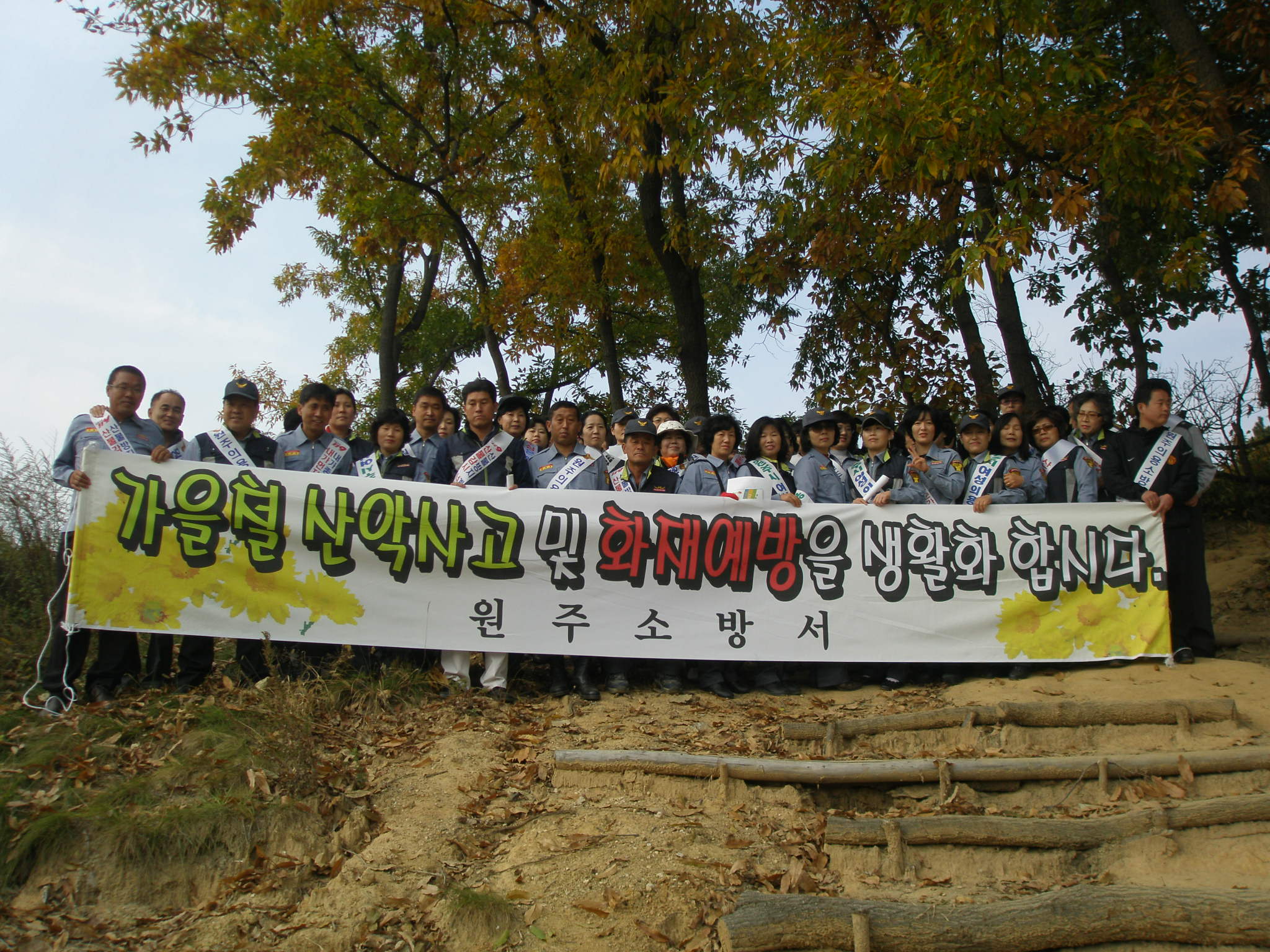 원주소방서(서장. 조근희)는 10월 26일 오전 10시부터 봉화산, 천은사 등산로 입구에서 단풍철 산행 등 웰빙 문화에 편승한 산악수요 급증으로 인한 산악사고 방지 및 산불예방 캠페인을 실시하였습니다. 원주의용소방대 외 5개대(원주여성,흥업, 흥업여성,귀래,귀래여성)의 약 150여명의 대원이 적극적으로 참여하여 내실있는 캠페인이 되었읍니다.
