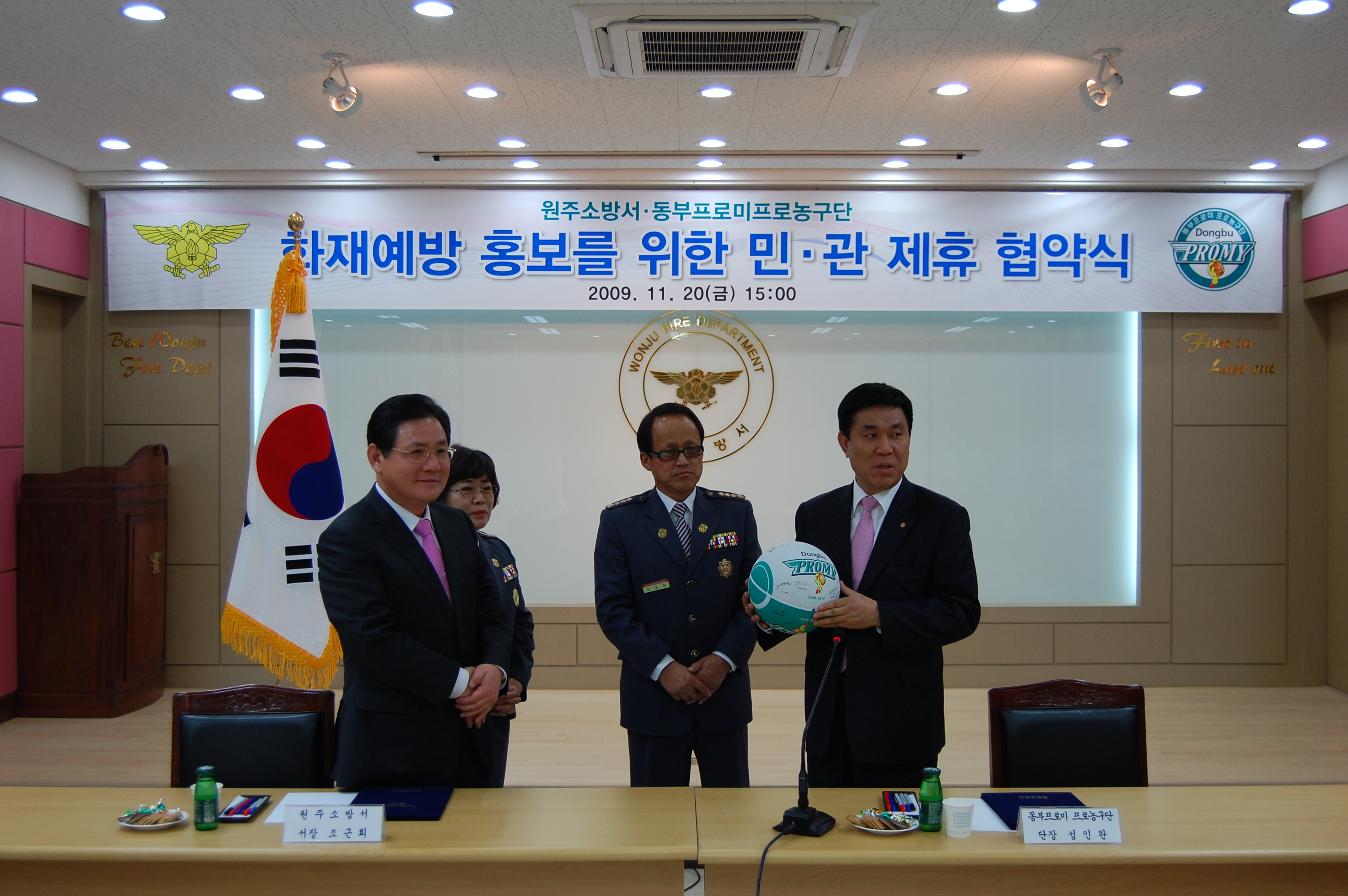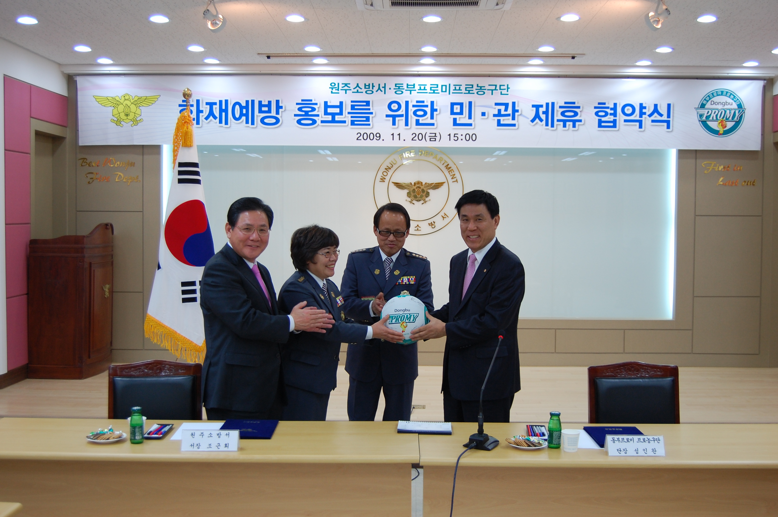 지난11/20일 15:00에 원주소방서 회의실에서 동부프로미와 함께 화재예방,홍보를 위한 민,관제휴 협약식이 있었습니다. 원주소방서 서장님(서장 조근희)이하 직원들 남,녀 의용소방대 연합대장님이 함께 참가하여 화재예방에 대한 의식을 더욱더 강화 하였고 늘 위험속에서 고생하시는 소방관님들에게 새로운 힘을 불어넣는 계기가 된것 같습니다. 앞으로 민,관이 힘을 합하여 화재예방에 대한 홍보를 펼쳐 나간다면 우리곁에 화재란 있을수 없을거라 생각하며 우리모두 불조심 합시다.