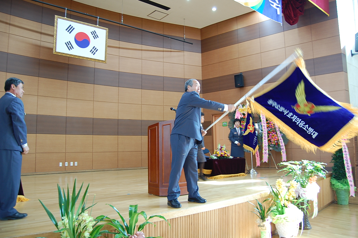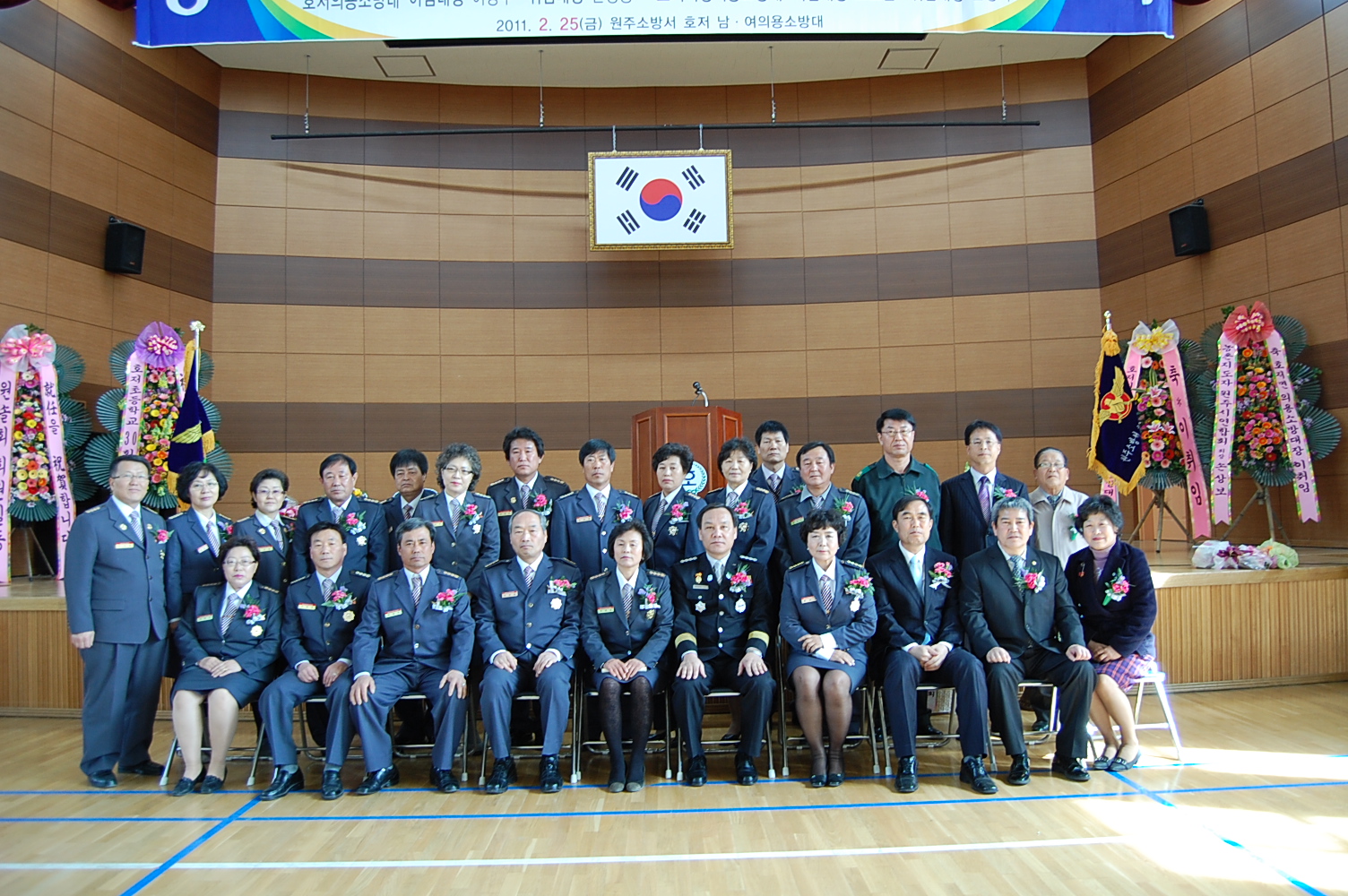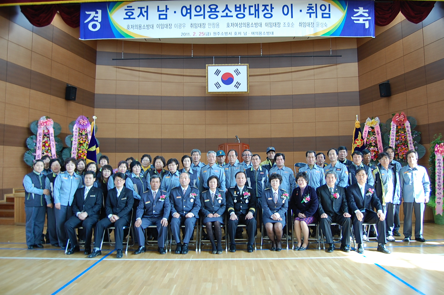 원주소방서(서장. 박창진)는 2011.02.25 (금) 10:30 - 호저초등학교 강당에서(호저면 소재)에서 제9대, 2대 호저남여의용소방대장 이취임식을 가졌습니다.
