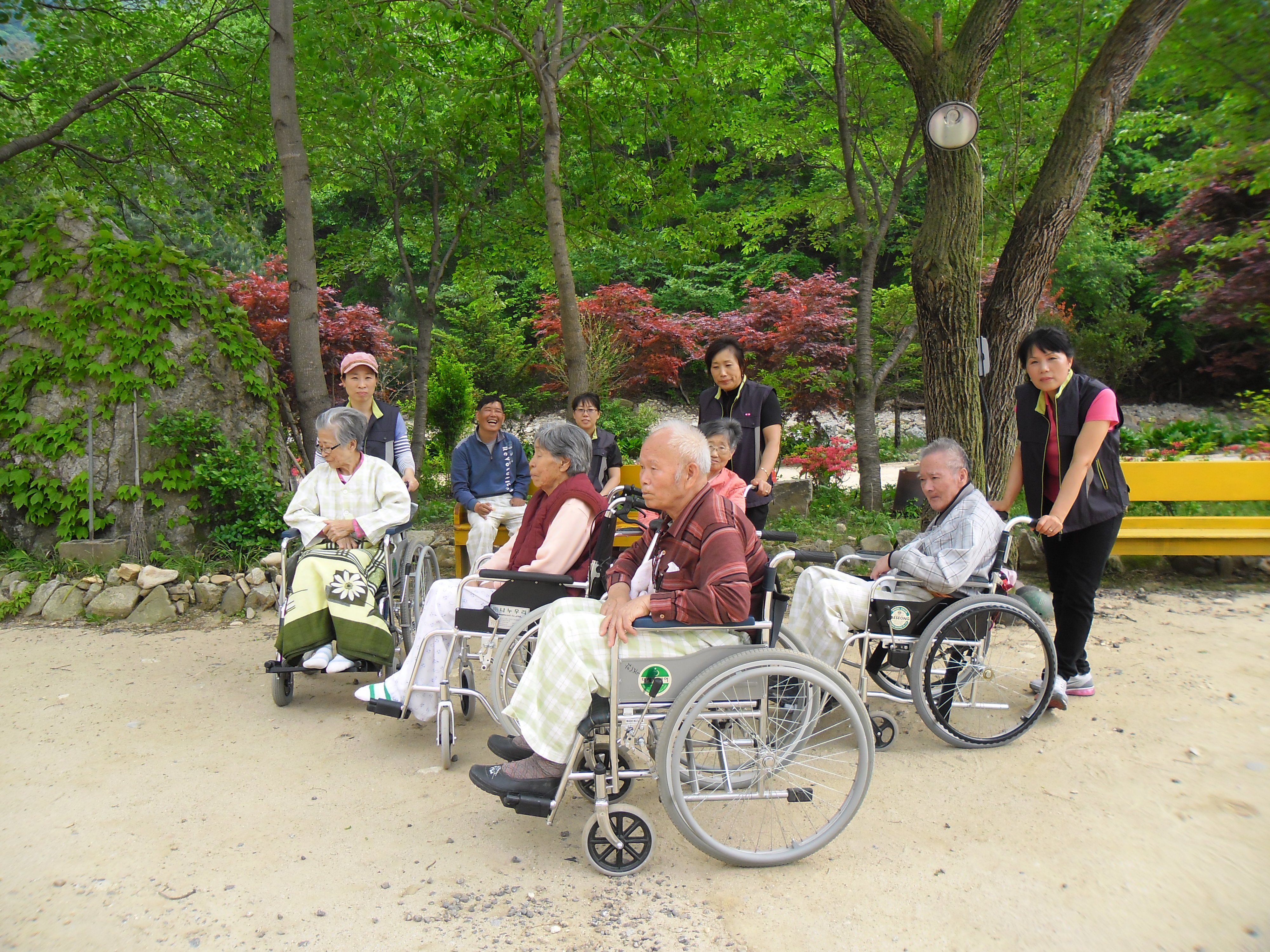 할아버지 할머님들의 방과 식당, 휴게실을 청소하여 들이고 밖으로 나가서 산책을 하였습니다. 주변에 꽃들도 많이 피고 개울도 있고 공기도 상쾌하고 저희들까지 기분이 좋았습니다. 할아버지 할머님 몸 건강하세요.