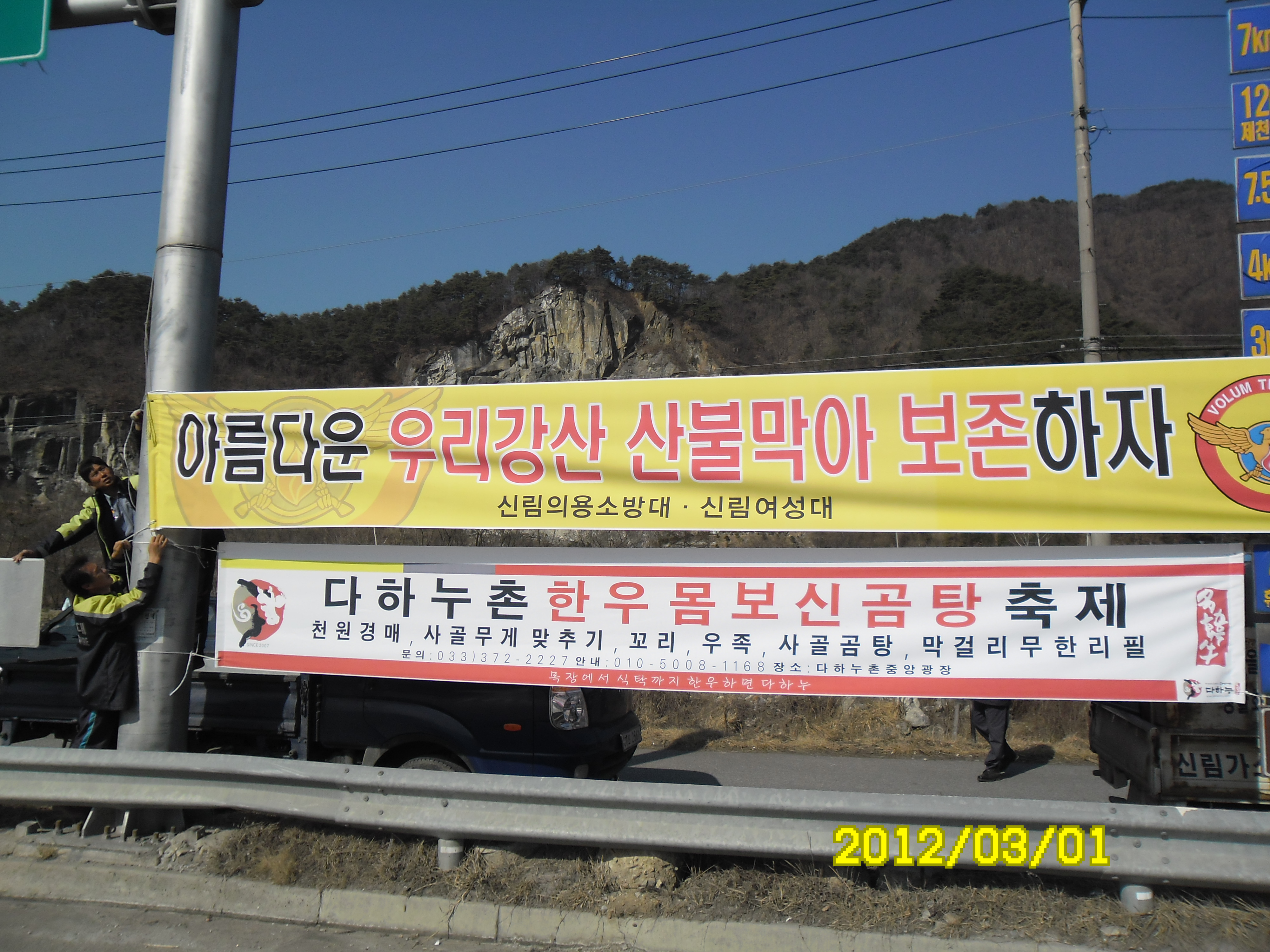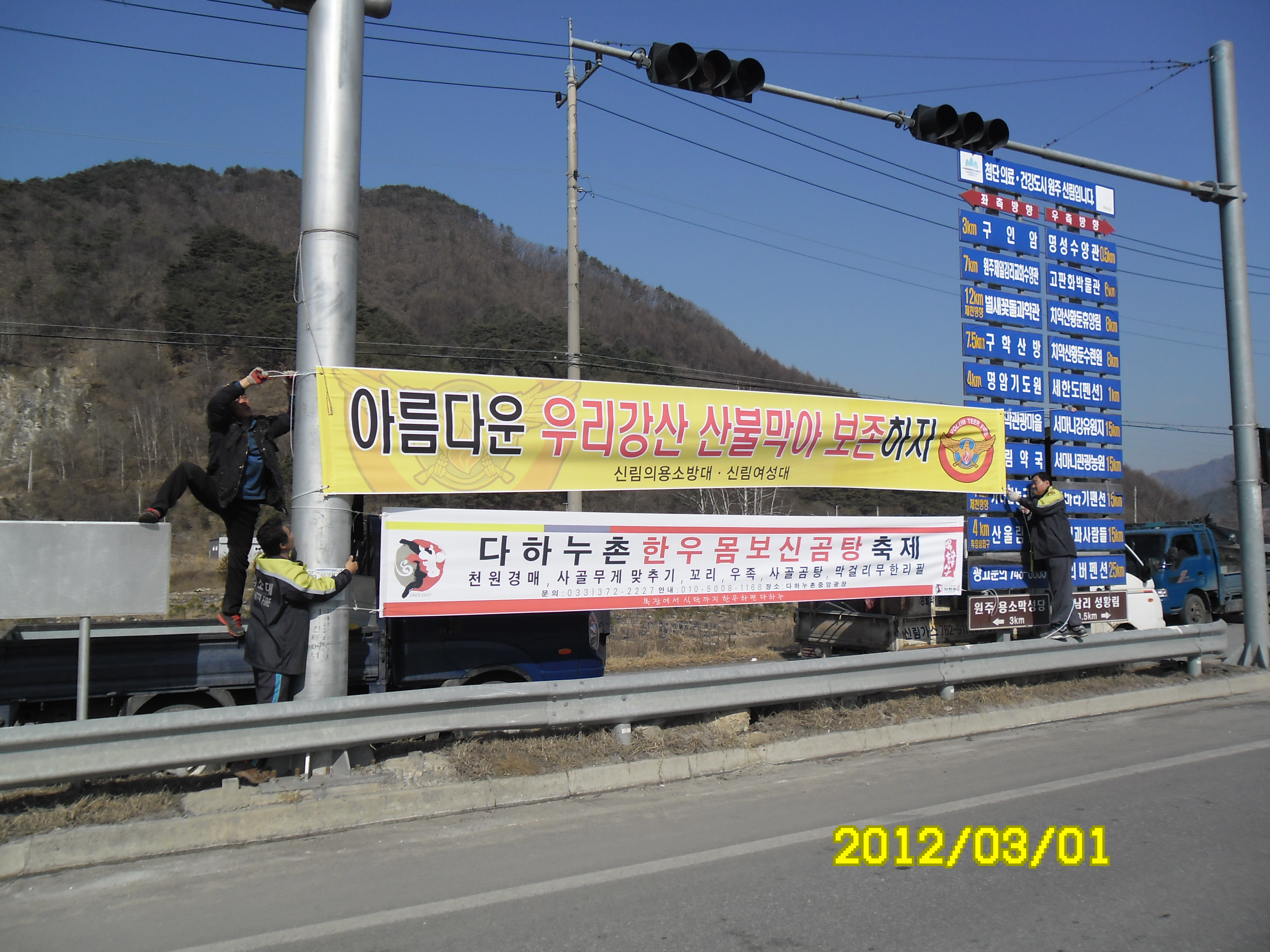 입구에서 산불 캠페인 및 산불조심 현수막을 설치 하였습니다.