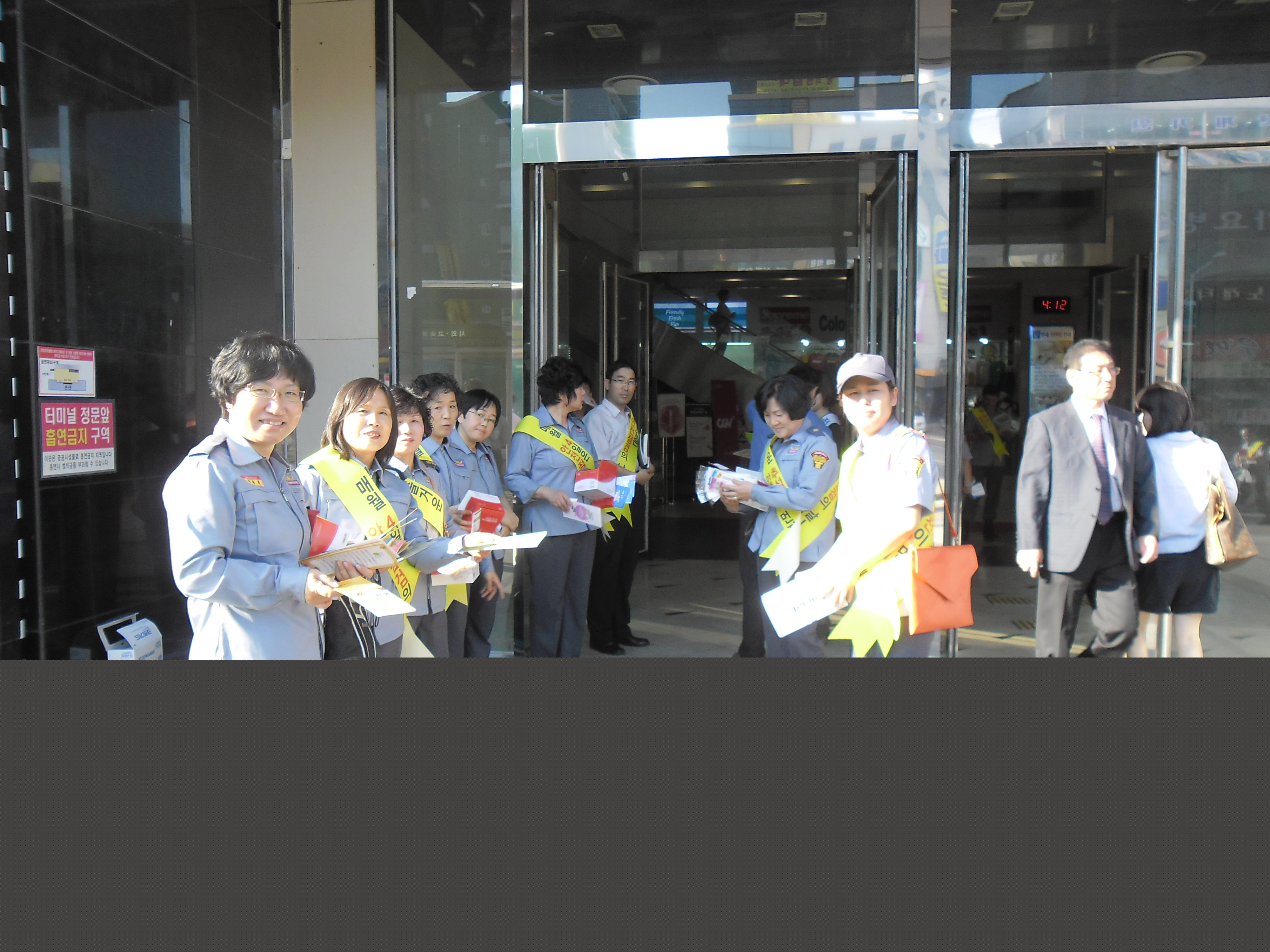 고속버스터미널에서 어깨띠 두르고 사진촬영