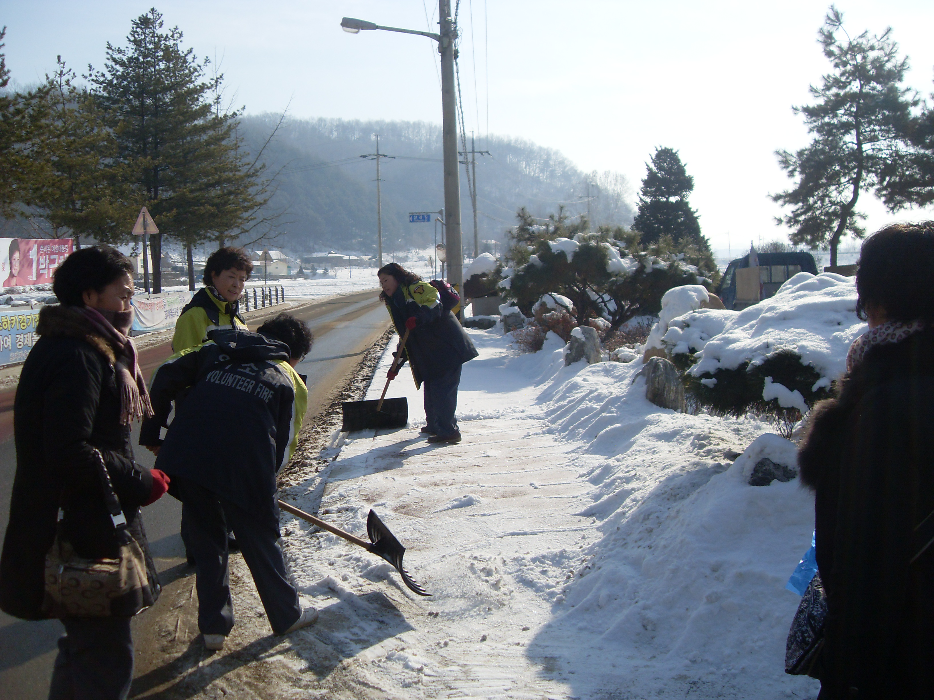 교육이 끝나고 폭설로 미끄러워 불편한 도로가에 눈을 치웠습니다