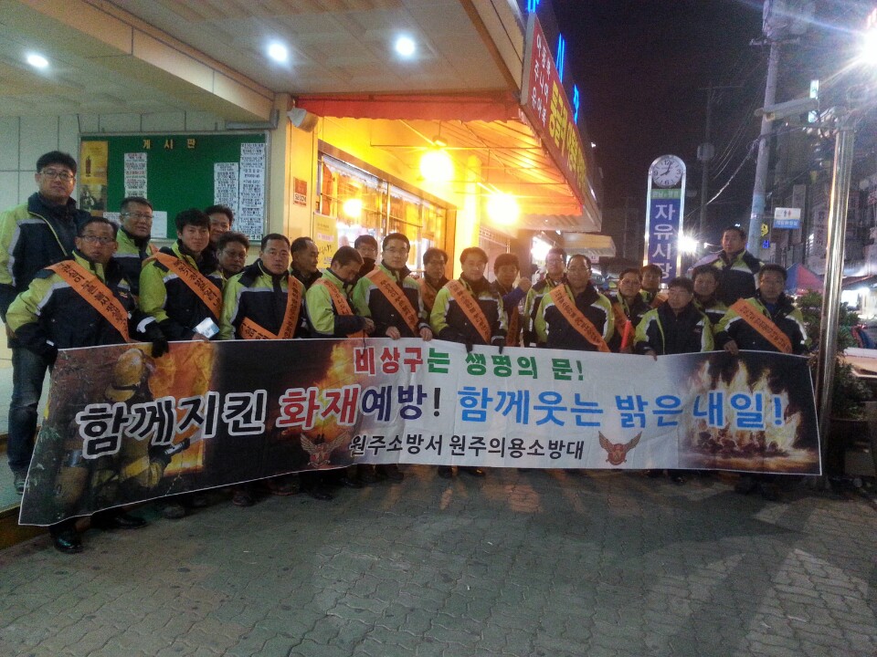 원주의용소방대(대장 조성일)는 11월22일 오후 7시부터 11월 정기교육을 실시했습니다. 교육후 단구시장,남부시장,중앙시장,자유시장등 화제예방과 순찰을 대원 46명이 참가하여 실시하였습니다.