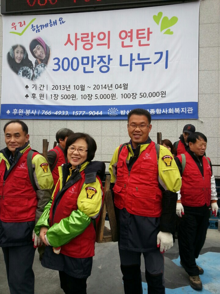지정여자의용소방대장이자 연합대 회장이신 박인수대장님께서 2013년12월7일토요일에 밥상공동체에서 사랑의연탄 나누기행사에 참석해서 연탄5000장을 독거노인들에게 아침10시부터12시까지 지게로 지어날랐읍니다.