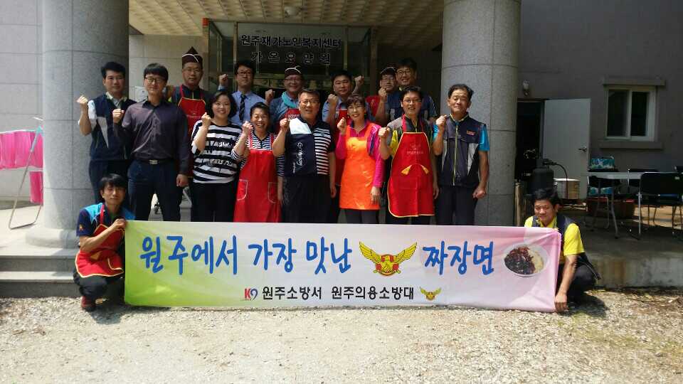 원주의용소방대(대장 조성일)는 5월13일 가온요양원 어르신에게 자장면 중식 봉사를 실시했습니다. 이날 봉사에는 원주의용소방대,대원 15명이 참가했습니다