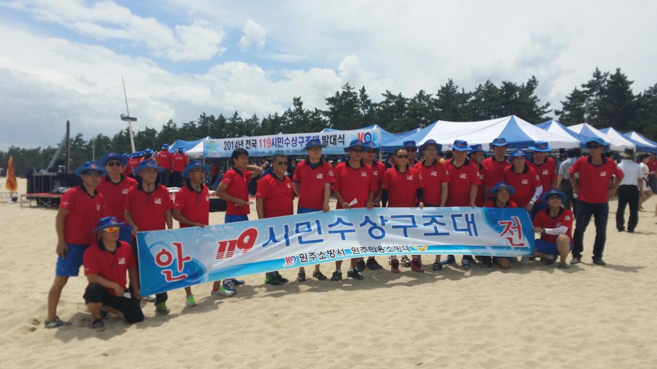 원주의용소방대(대장 조성일)는 7월9일 강릉 경포대 해수욕장에서 2014년 전국119시민 수상구조대 발대식에 대장님외 32명이 참가했습니다
