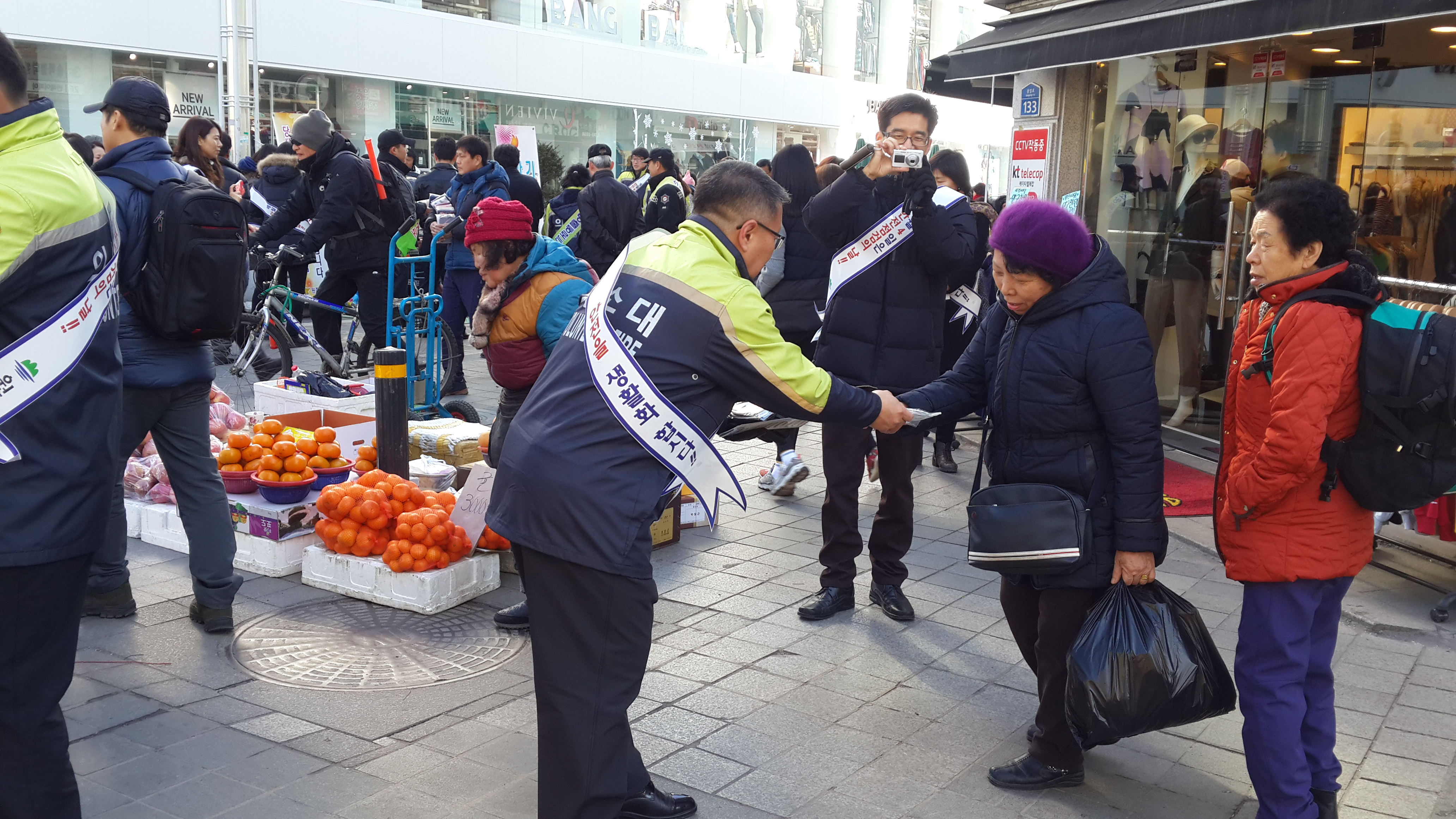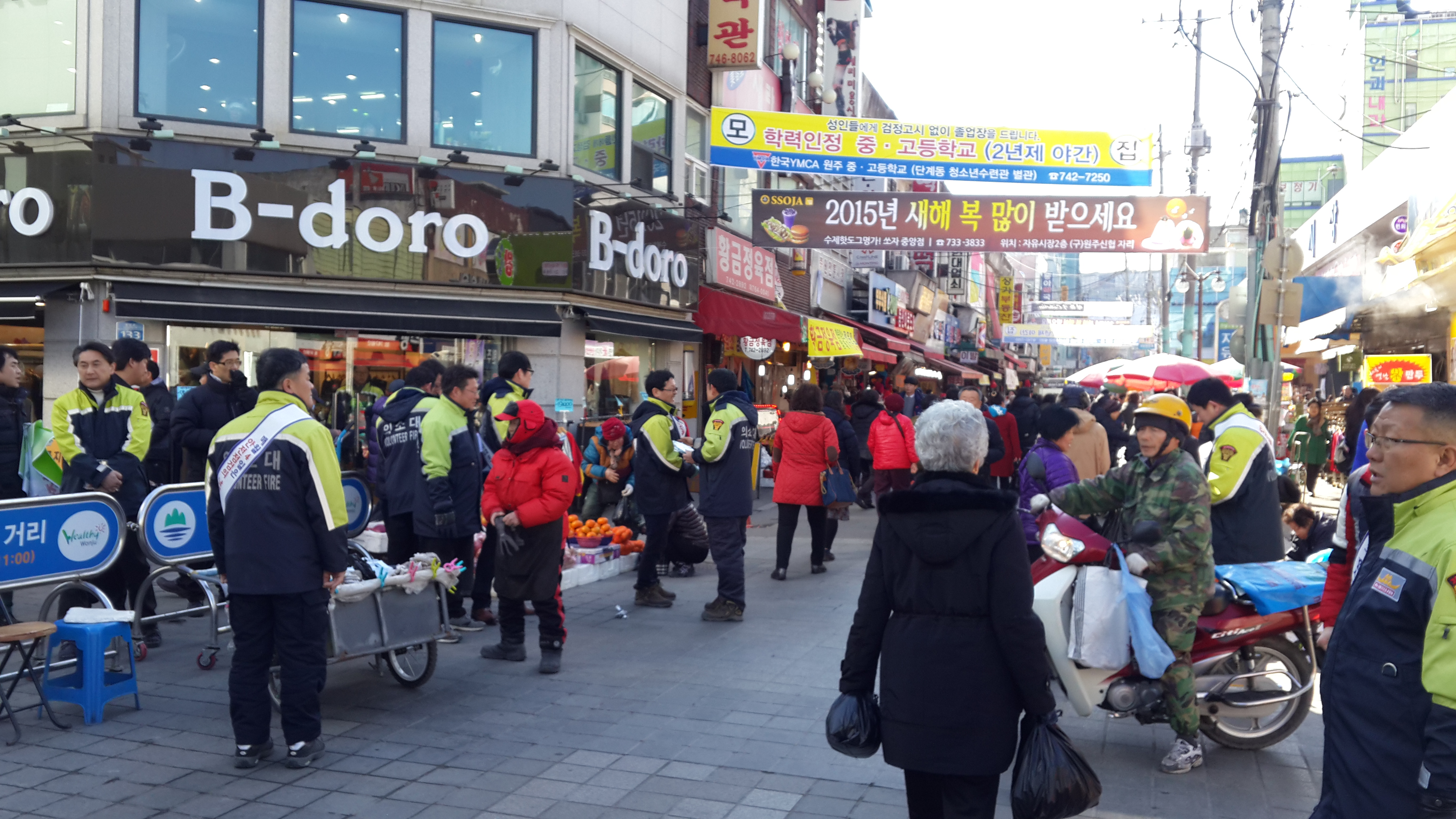 원주남성의소대(대장조성일)는 2월13일 오후2시 중앙시장 문화의거리에서 대장님외 대원 20명이 참가하여 설날 안전켐페인을 실시했습니다.