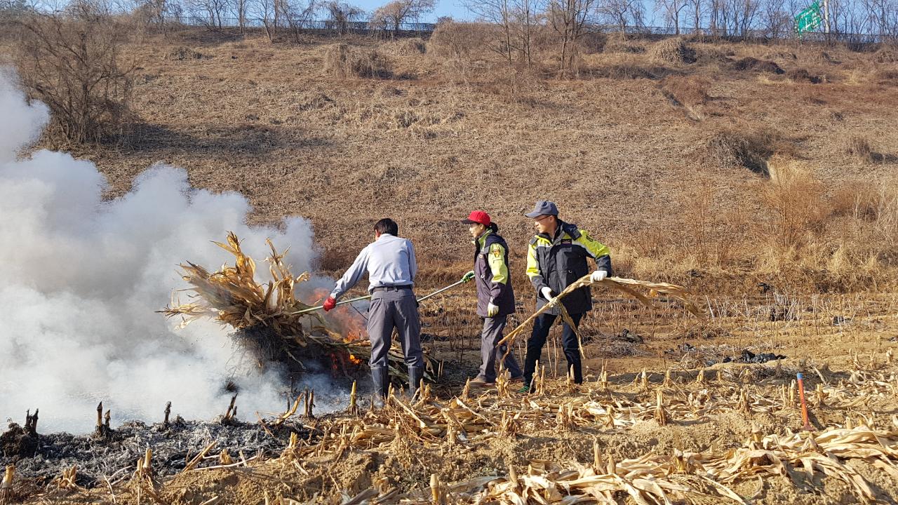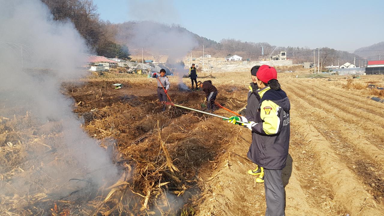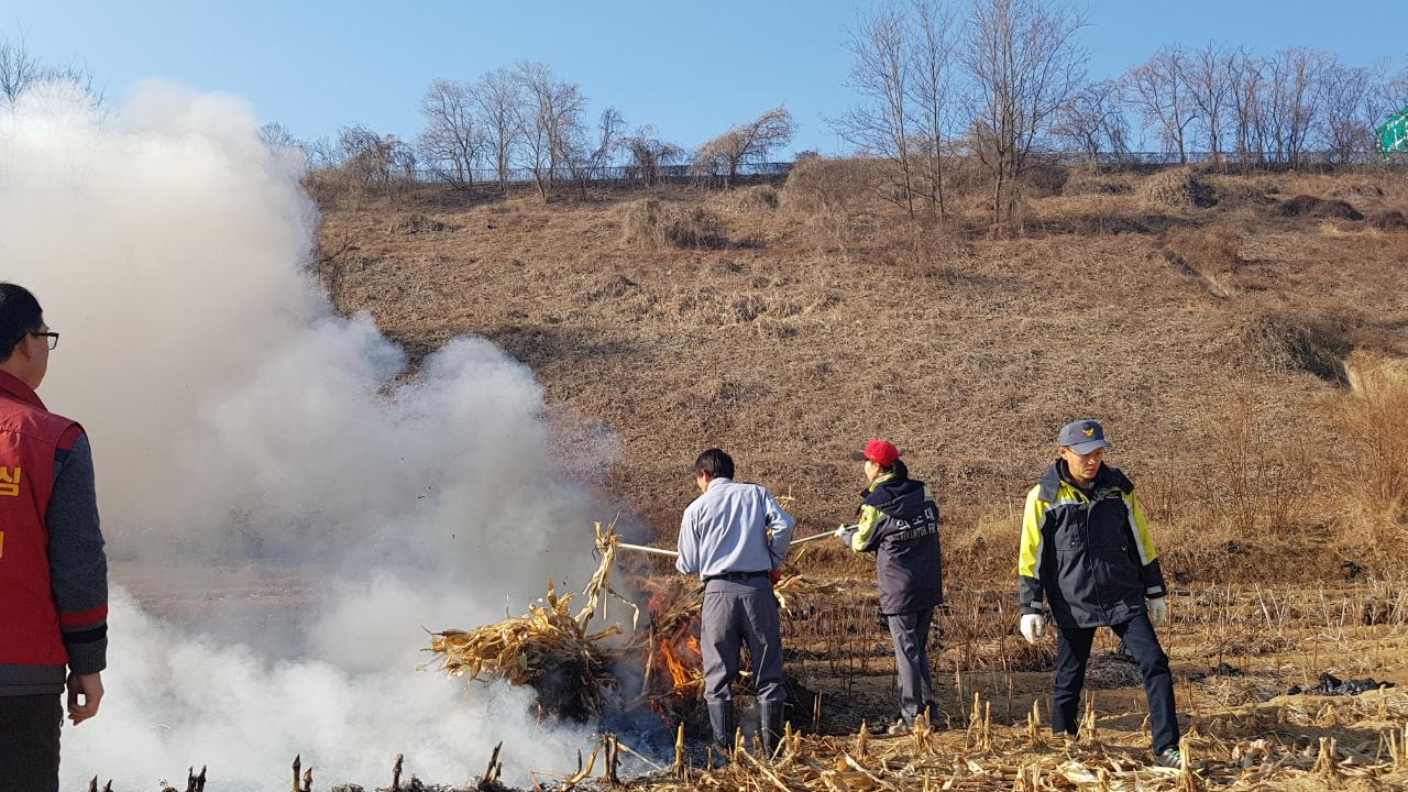 흥업리 논부산물 태우기 활동 을 하고 화재 예방 황동도 함