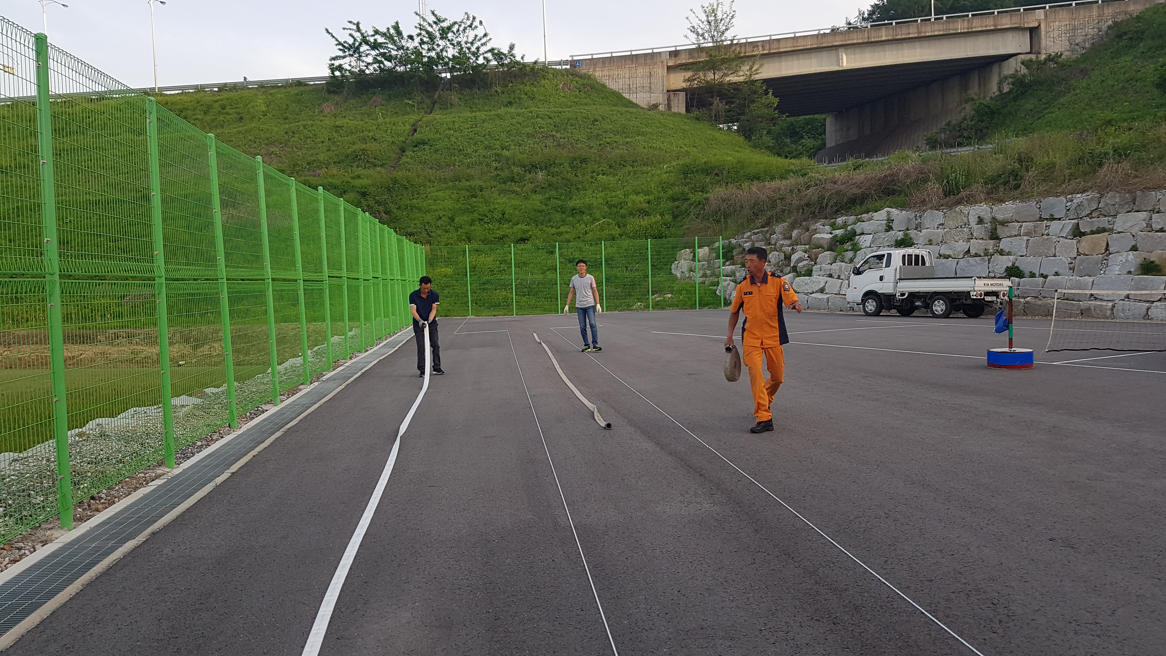 참가를 위하여 수관연장 방수자세 연습을 시작하였습니다.