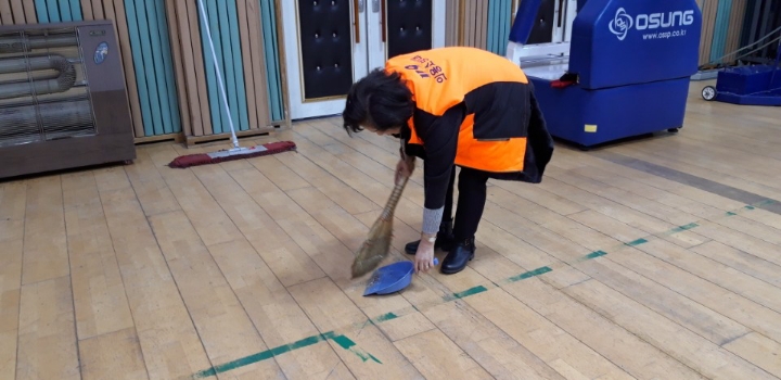 내용: 체육관 실내 바닥청소 및 입구먼지제거 쓰레기분리수거