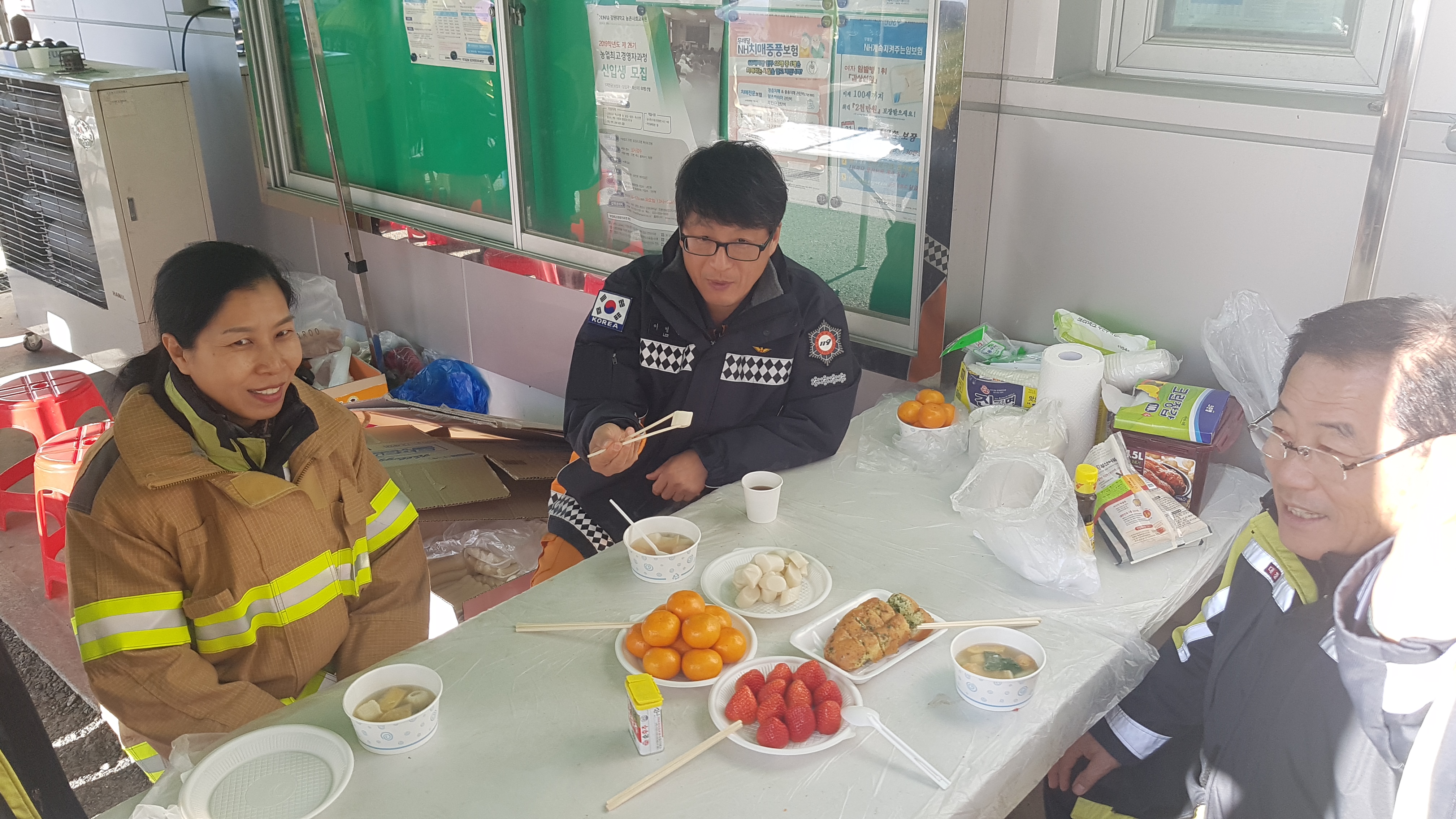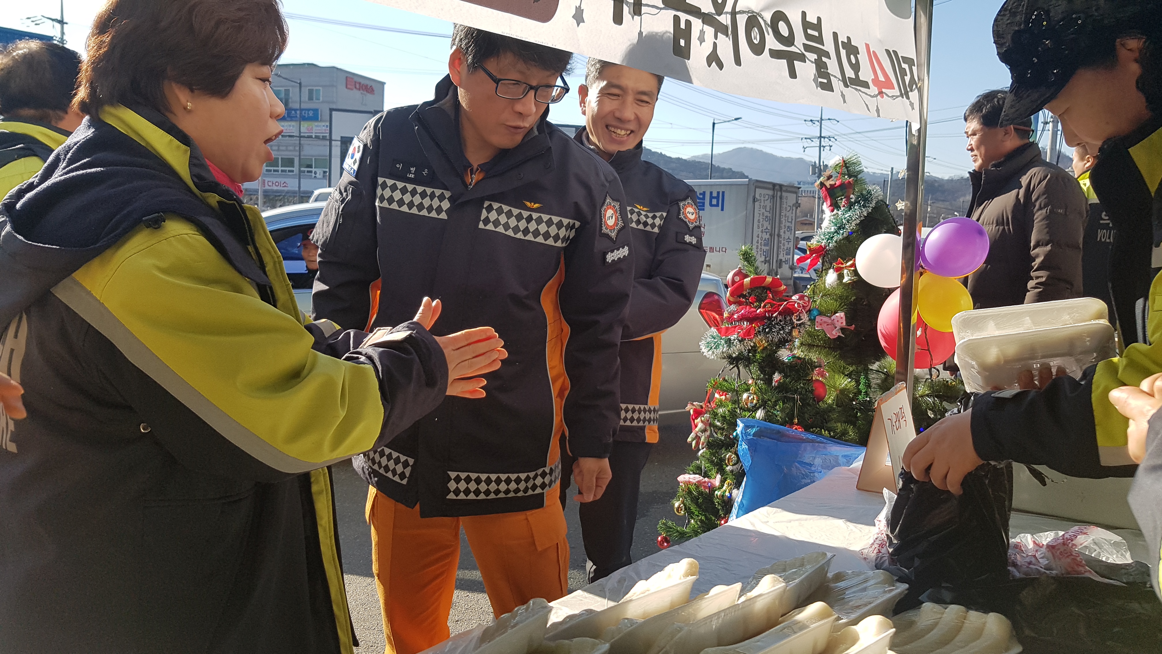 추운 날씨에도 불구하고 불우이웃돕기 행사에 임하는 대원분들에게