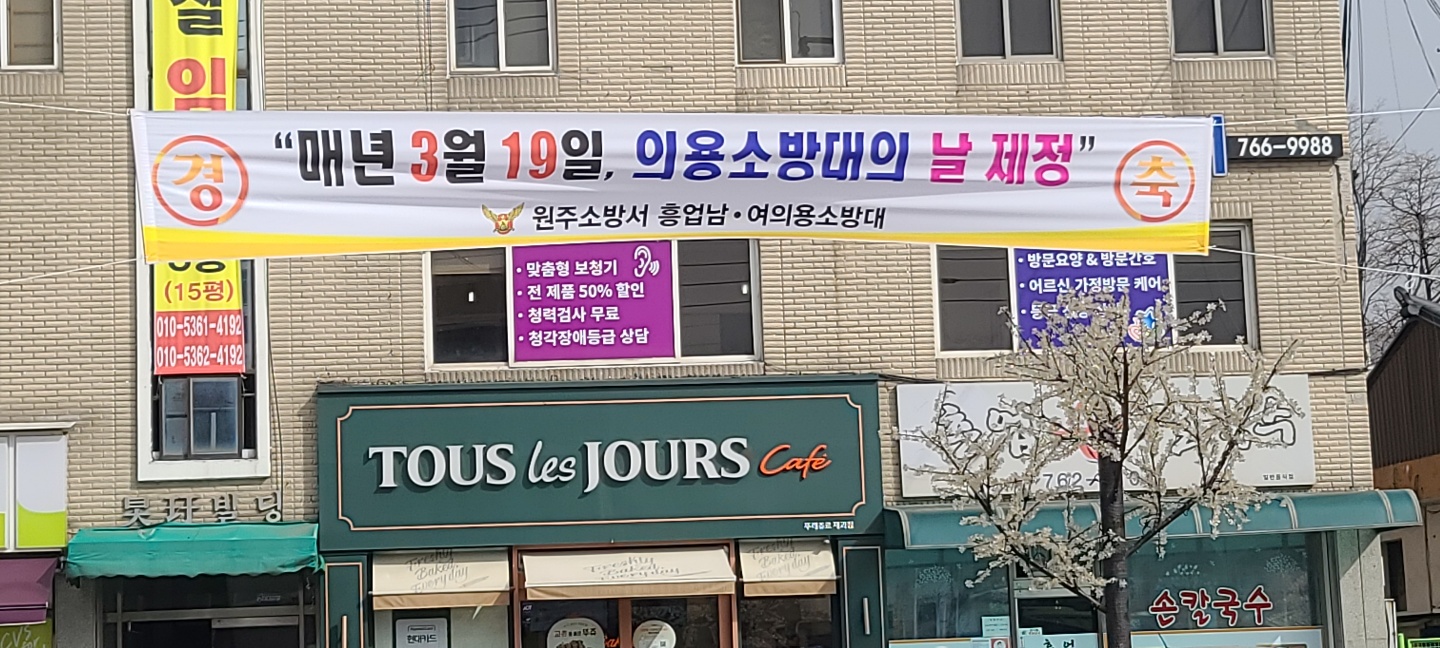 흥업남성의용소방대 " 매년 3월19일 의용소방대의 날 제정"현수막 게첨