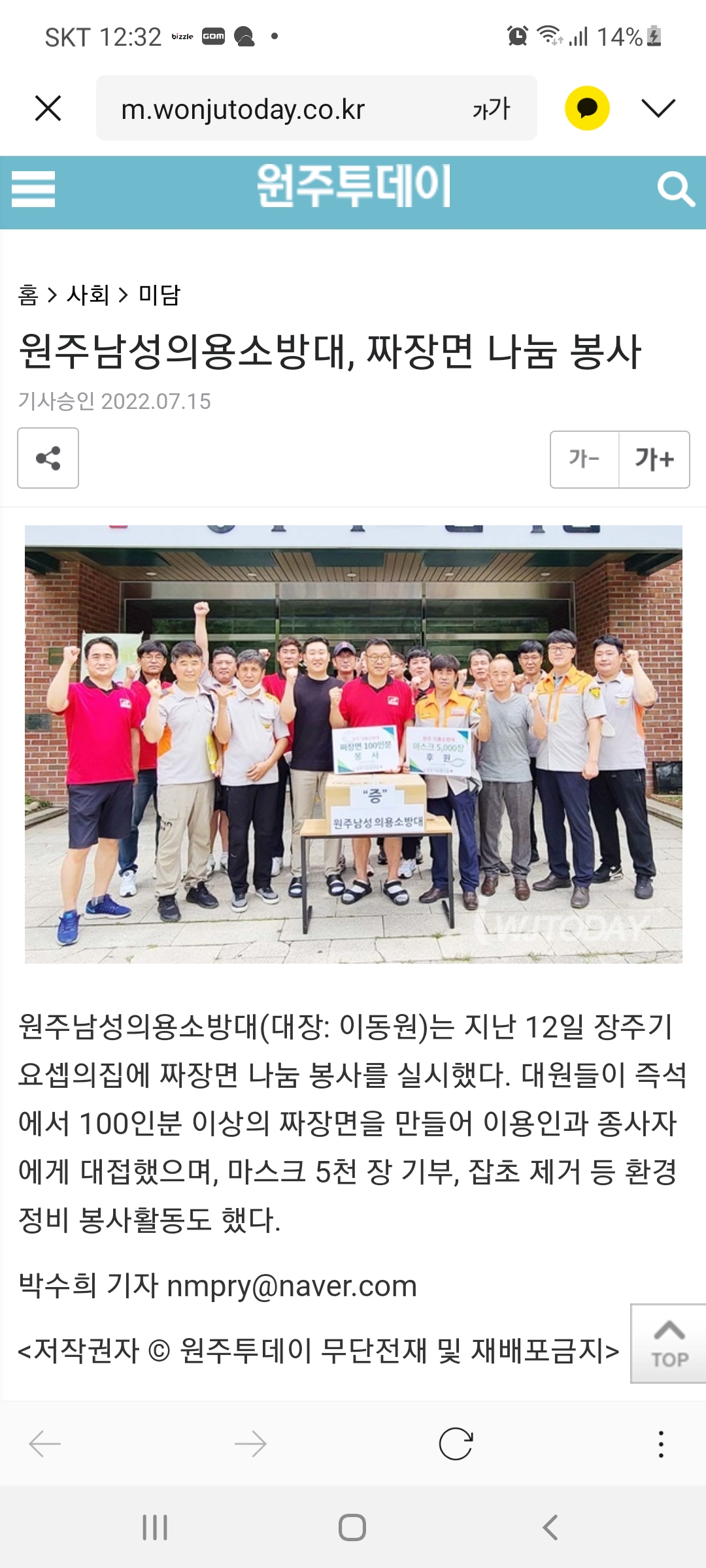 원주남성대 : 짜장면봉사 및 잡초제거, 마스크전달