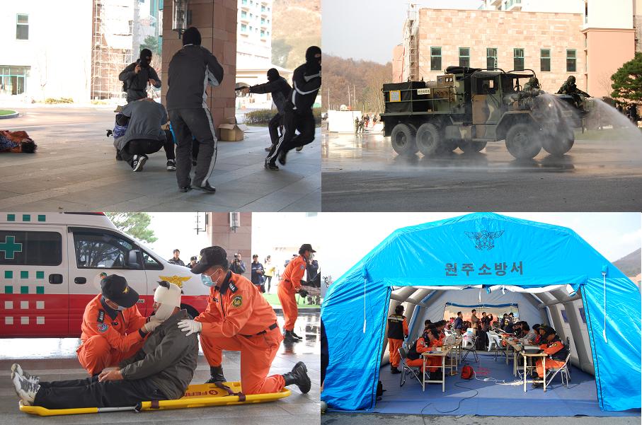 이번 훈련은 오크벨리 콘도건물에 신원 미상의 테러 분자들이 침입해 폭발물을 설치하고 화학물질을 유포하며 직원들을 인질로 잡고 있다는 가상의 시나리오에 따라, 화학테러대응, 폭발물테러대응, 화재대응, 복구대응의 4단계로 진행되었다.