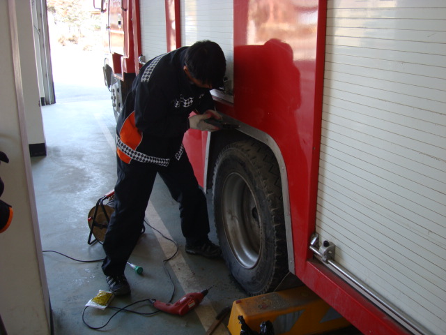 이번 점검때 붙어 있는 생석회를 때어내는건 물론... 펌프차량 뒤 타이어 부근을