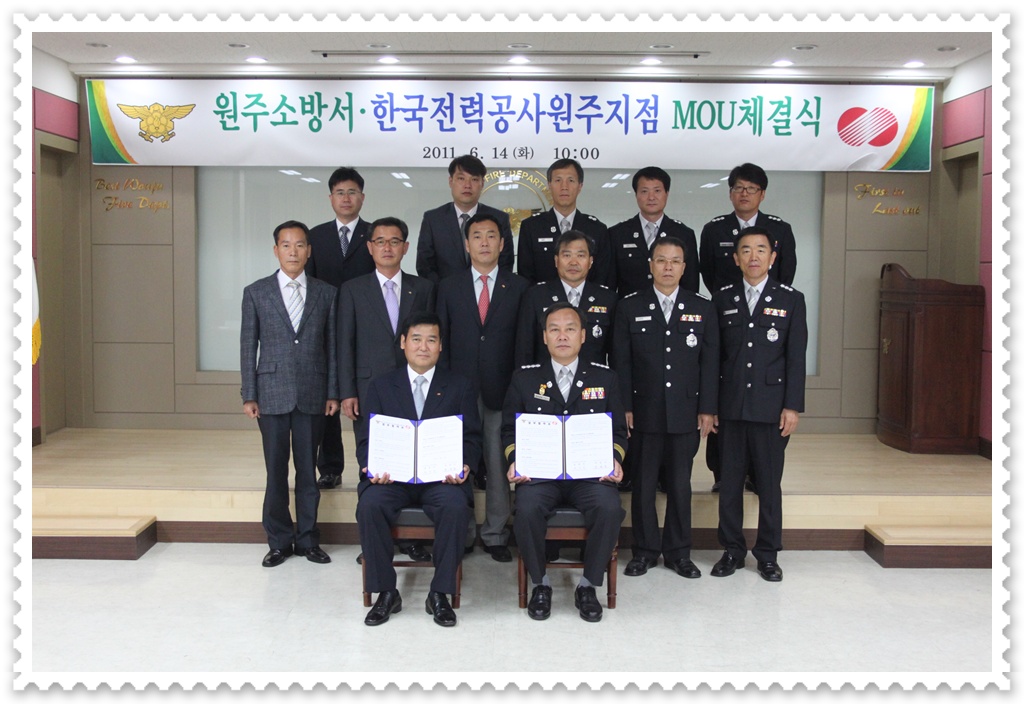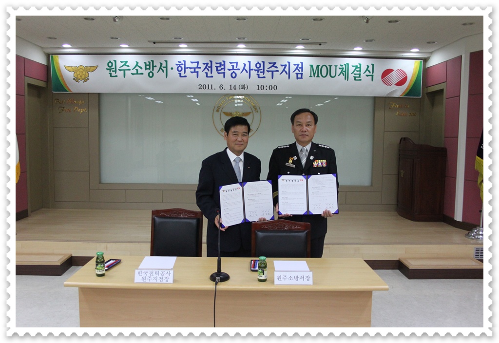 원주소방서(서장 박창진)와 한국전력공사원주지점(지점장 송관식)은 14일(화) 오전 10시 원주소방서 대회의실에서 화재와의 전쟁관련 상호업무협약(MOU) 체결 행사를 가졌다.