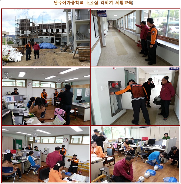 현장대응과에서는 원주여자중학교 현지출동 적응훈련과 교원을 대상으로 소소심 익히기 체험 교육을 실시하였다. 아울러 학교내 증축공사 관계자에 대한 공사장 화재예방 안전교육 및 세월호 침몰사고 관련 화재시 대피유도 요령 및 안전수칙 교육을 병행실시하였다.