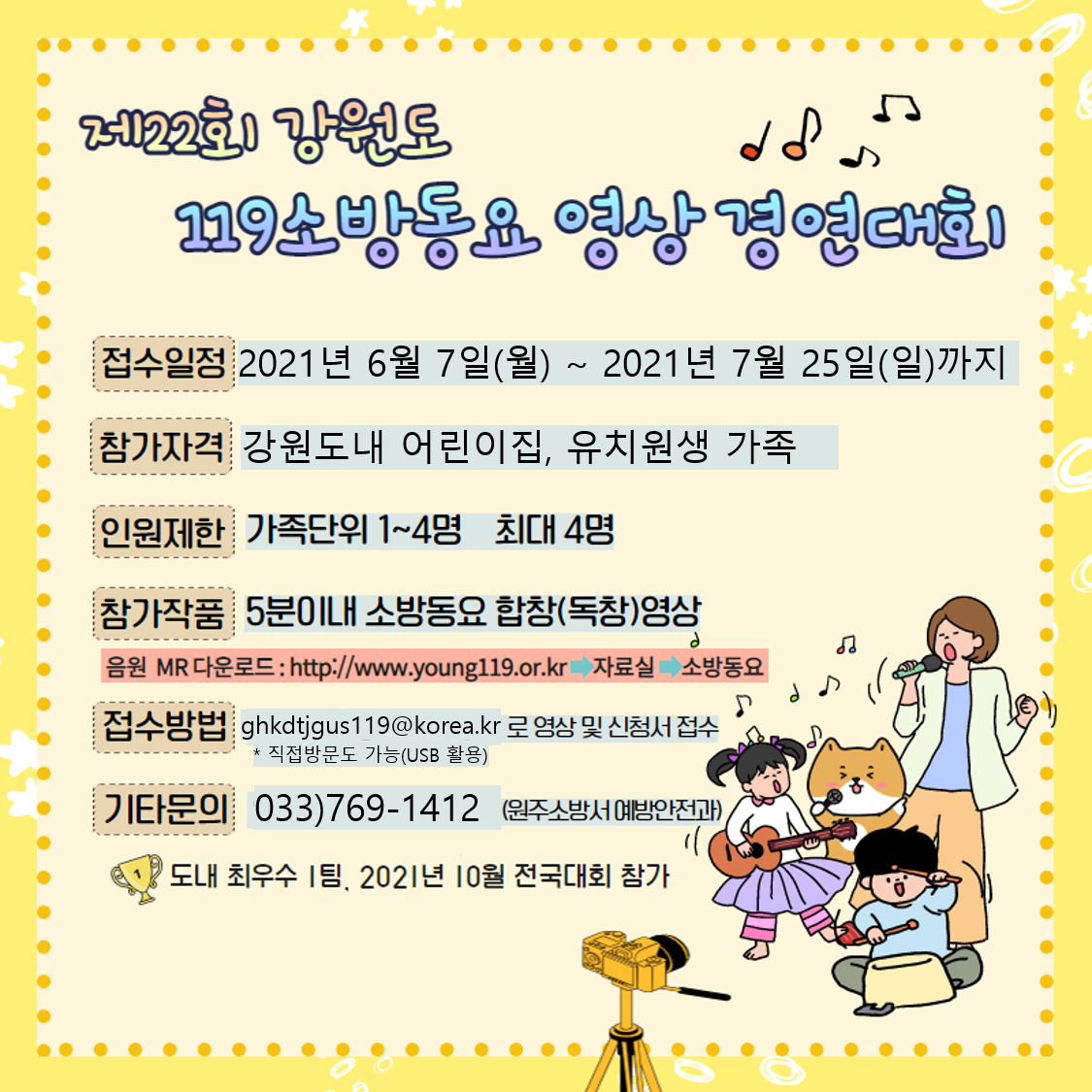 | 3310 | 제22회 강원도 119소방동요 영상 경연대회 참가팀 모집 | 원주홍보 | 2021-06-07 | 769 | |