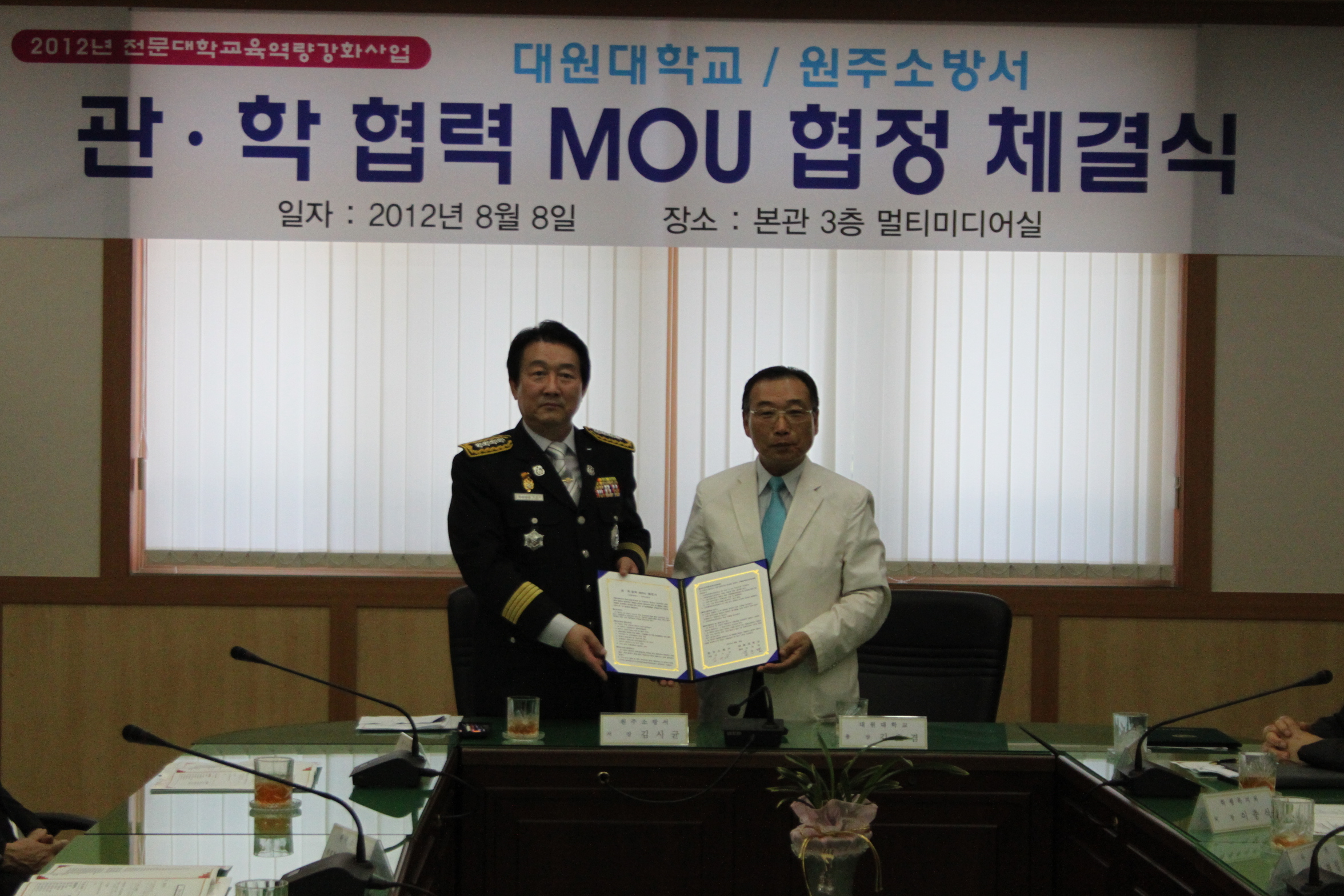 원주소방서(서장 : 김시균)는 8일(수) 대원대학에서 생명을 구하는 사람들 프로젝트 추진의 일환으로 관 , 학 협력 업무협약을 체결했다.