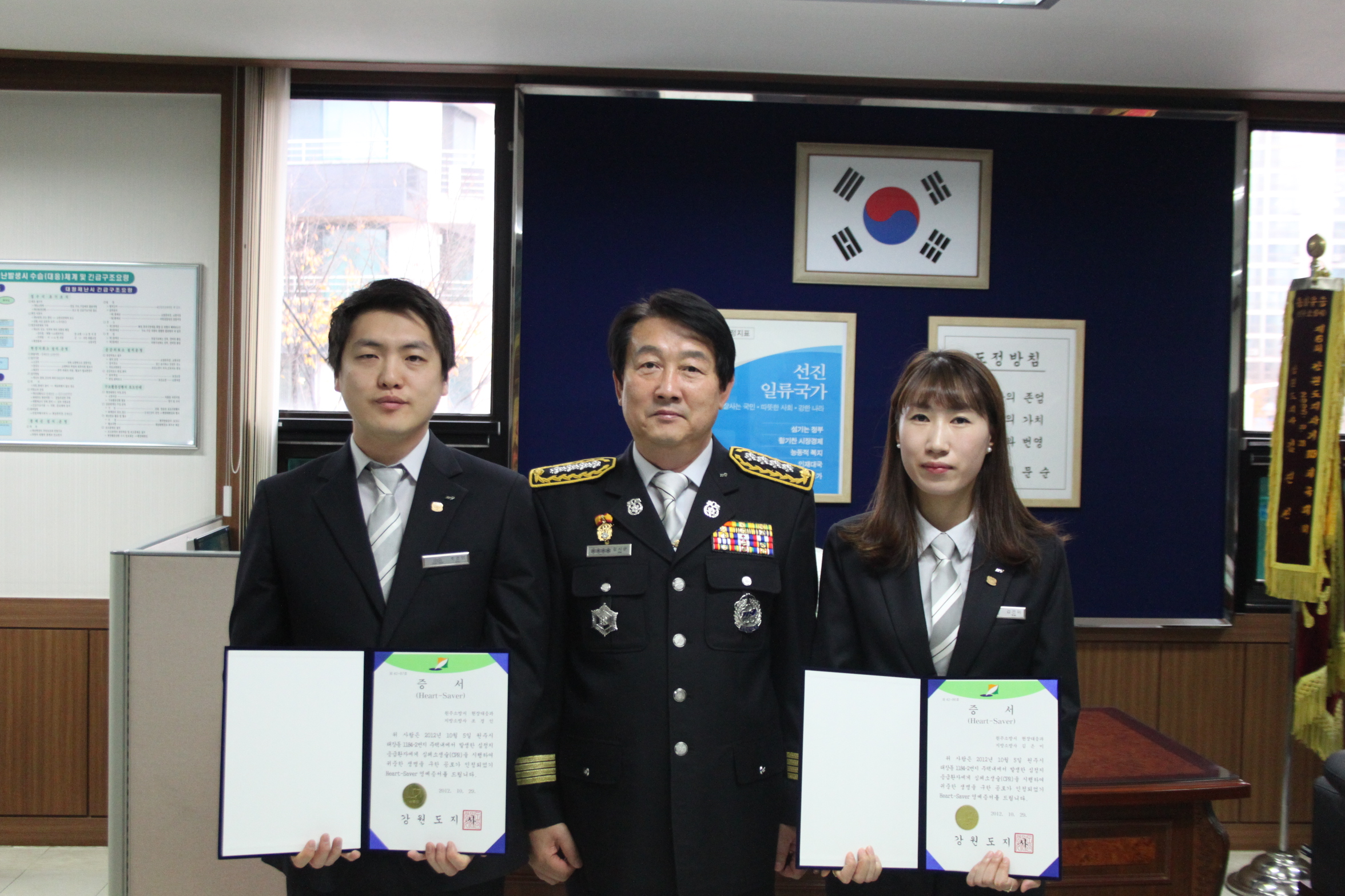 김시균 원주소방서장은 12일 오전 9시 원주소방서장실에서 지난 5일 태장동 주택에서 발생한 심정지 환자를 구한 학성구급대 소방사 김은미, 조경인에게 하트세이버 증서와 배지를 전달 했다.