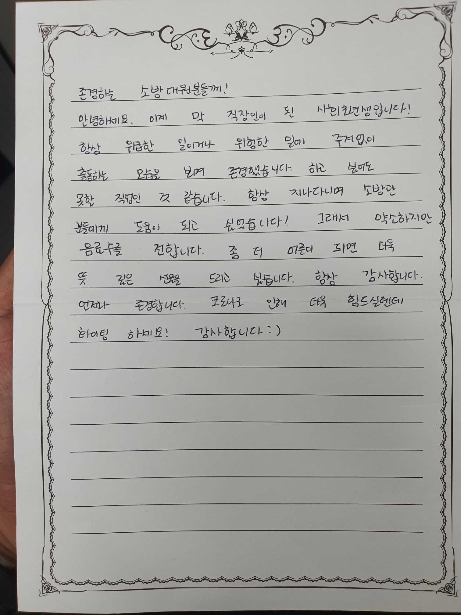 원주소방서 직원여러분 편지를 읽으시고 기분좋은 하루 보내기시 바랍니다.