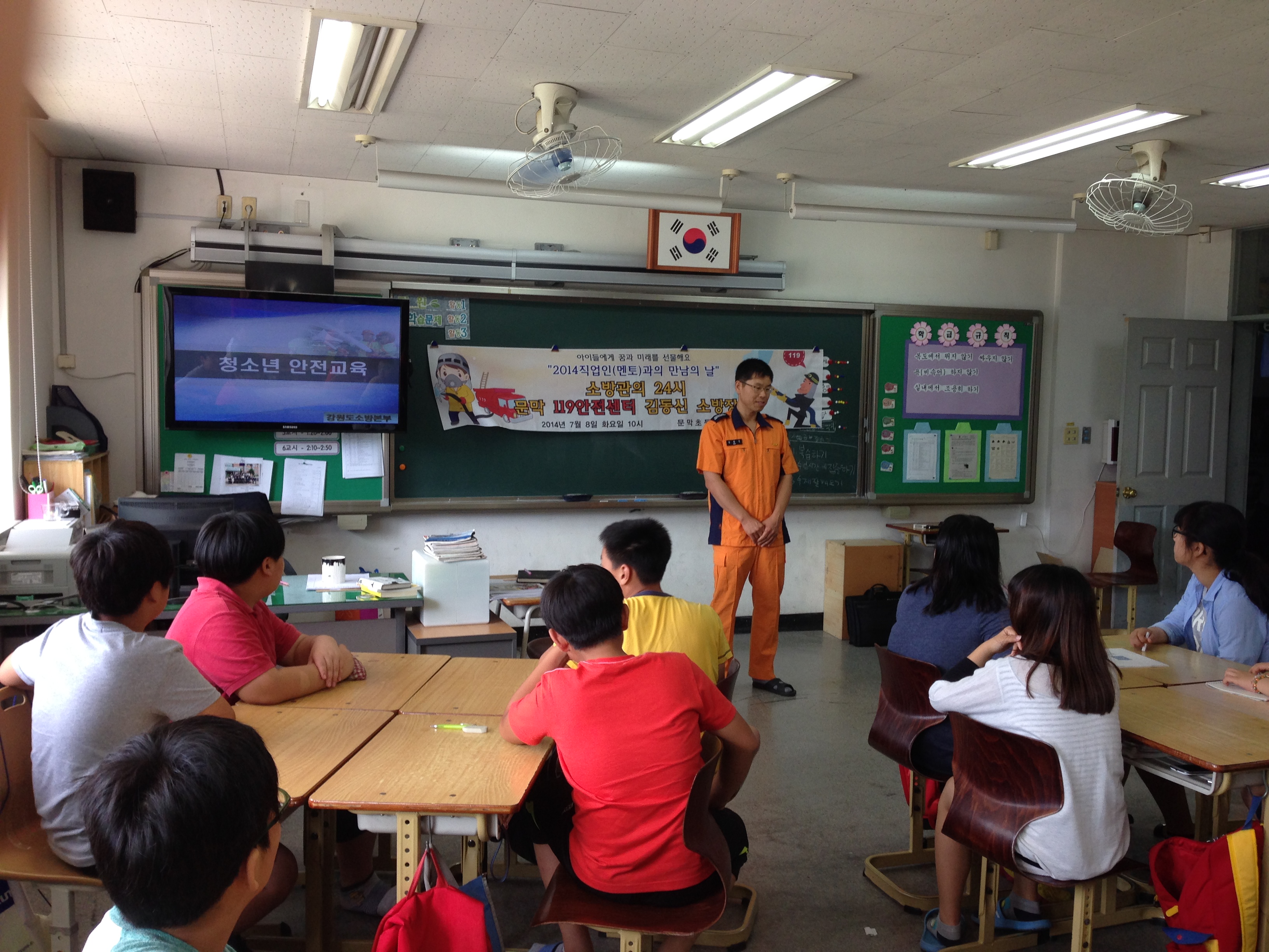 문막초등학교에서 진로체험주간을 맞이하여 실시한 직업인(멘토)과의 만남의 날 특강을 흔쾌히 허락해주신 김동신 소방장님께 감사인사를 전합니다. 소방장님은 2014년 7월 8일 문막초에서 실시한 직업인과의 만남의 날에 <소방관의 24시>라는 주제로 열띤 특강을 해주셨습니다. 이 기회로 학생들은 진로 탐색 및 직업선택의 기회를 넓힐 수 있게 되었습니다. 항상 문막주민의 안전을 위해서 애써주시는 원주소방서 문막119안전센터에 감사드립니다.