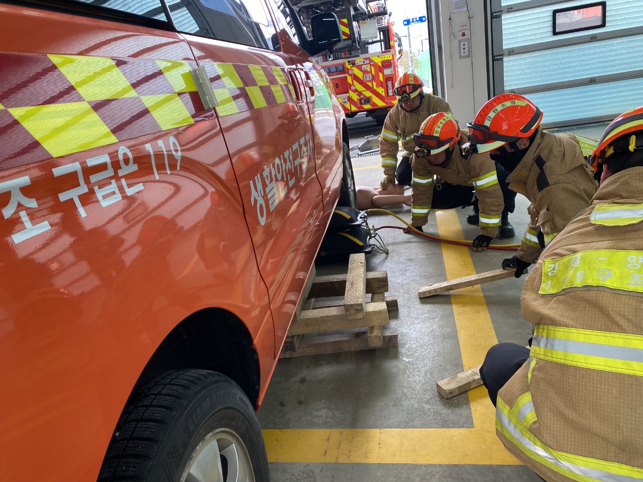 이번 평가는 ▲공기호흡기 장착 및 비상호흡법 ▲요구조자 검색 및 운반 ▲교통사고 인명구조(에어백, 유압장비) ▲정맥로 확보 및 자동제세동기 사용법을 중점으로 진행됐다.