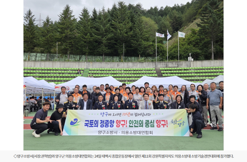 【양구】양구소방서(서장:권혁범)와 양구군 의용소방대연합회는 24일 태백시 종합운동장에서 열린 제11회 강원특별자치도 의용소방대 소방기술경연대회에 참가했다.