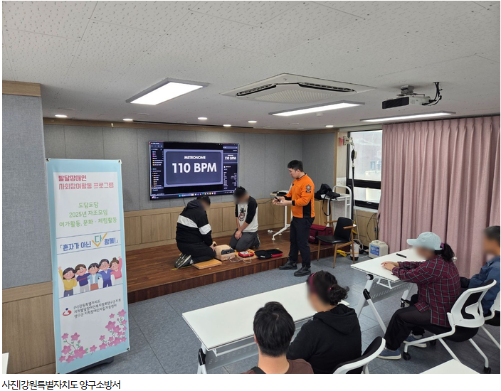 [스포츠서울ㅣ김기원기자]강원특별자치도 양구소방서(서장 권혁범)는 10월 22일 목요일, 양구행복나눔센터와 양구문예회관에서 각각 지적발달장애인복지협회 양구지부 회원 및 시설 직원, 양구군 시니어클럽 노인 회원과 직원을 대상으로 심폐소생술 및 하임리히법 등 응급처치교육을 실시했다.