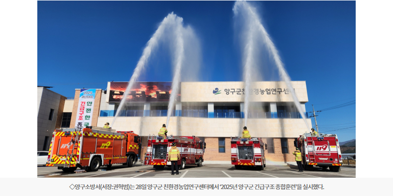 【양구】양구소방서는 28일 양구군 친환경농업연구센터에서 ‘2025년 양구군 긴급구조 종합훈련’을 실시했다.