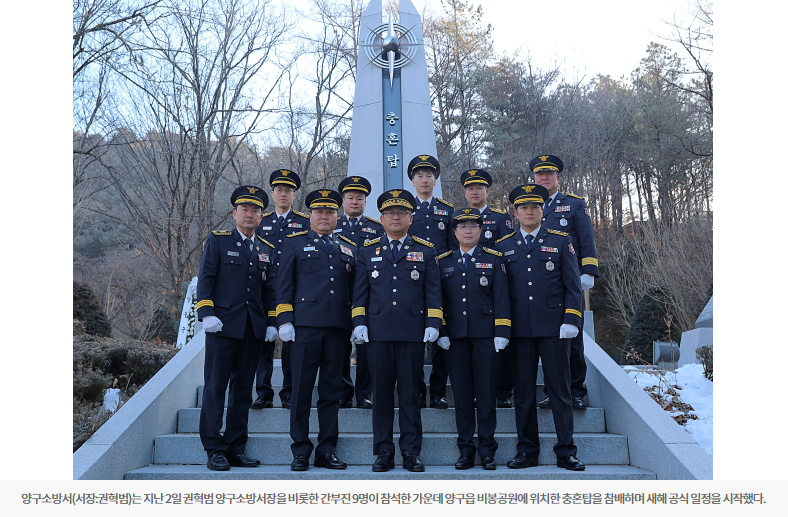 【양구】양구소방서(서장:권혁범)는 지난 2일 권혁범 양구소방서장을 비롯한 간부진 9명이 참석한 가운데 양구읍 비봉공원에 위치한 충혼탑을 참배하며 새해 공식 일정을 시작했다.