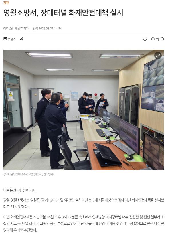 영월소방서(서장:김동훈)는 지난 20일 영월읍 팔괴1·2터널과 주천면 솔치터널 등에서 비상 피난 연결 통로 확인 및 관계인 현장 지도, 화재 예방 안전 컨설팅, 터널 내 신속 진입 훈련 등을 실시했다.