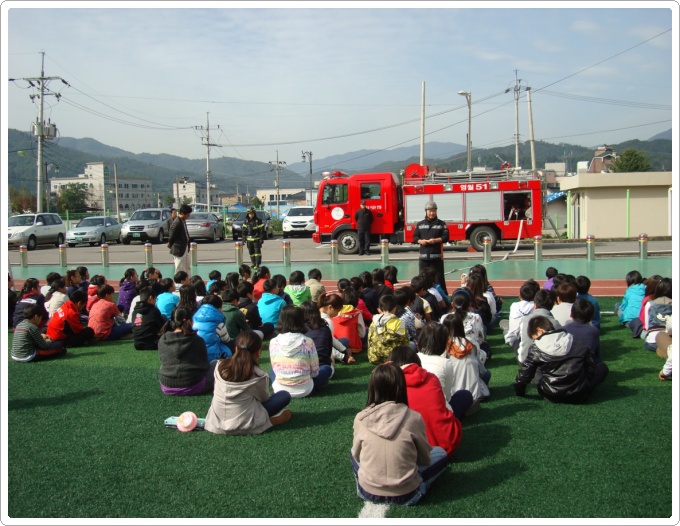 이날 교육은 소방서에서 하는 일에 소개를 시작으로 소방차량을 이용한 소방안전체험을 실시하고, 생활주변에서 발생할 수 있는 안전사고의 유형과 예방요령, 화재 등 긴급상활 발생시 119신고방법, 화재발생시 대처요령 및 피난요령을 학습 체험하는 시간을 가졌습니다.