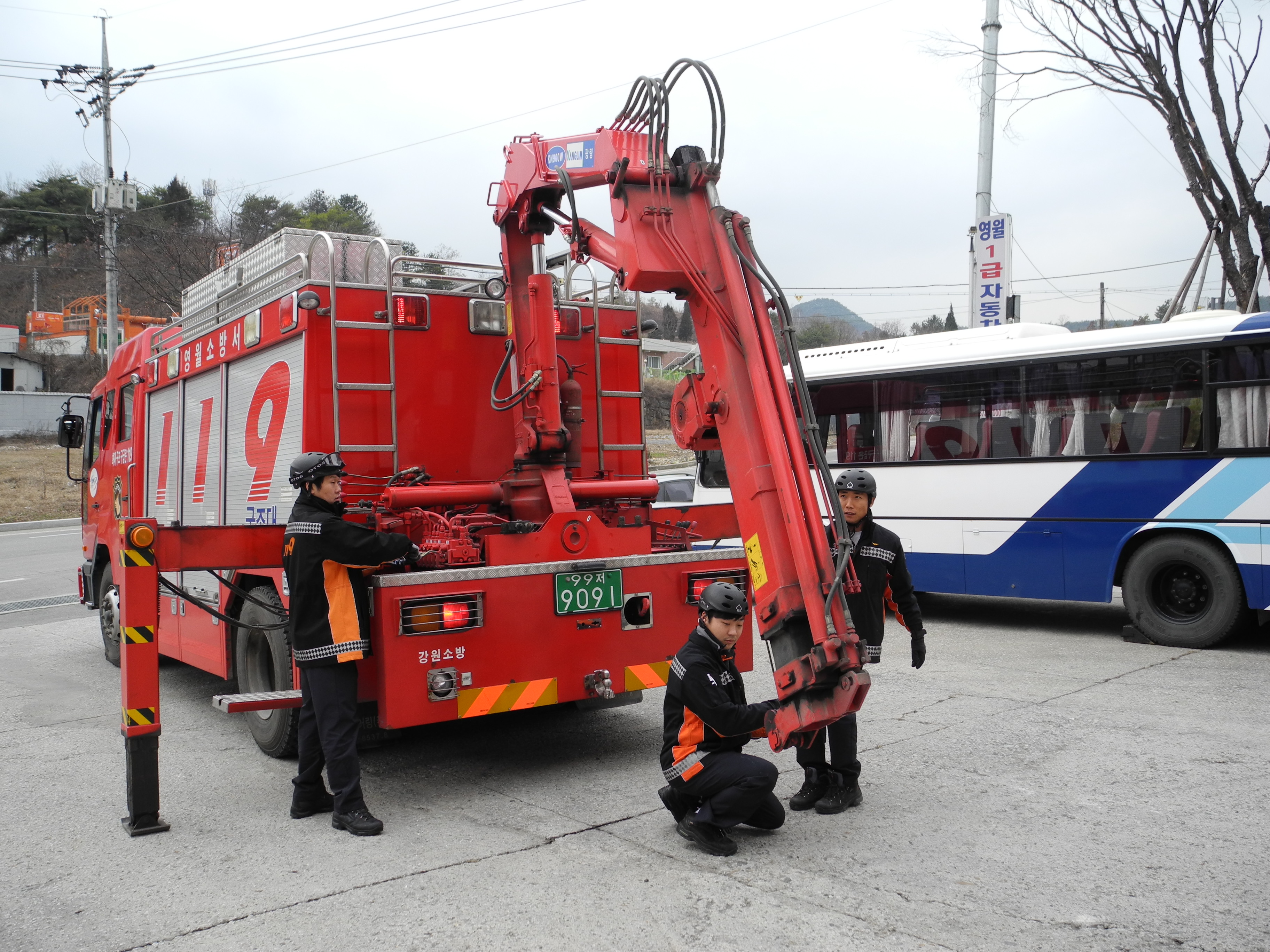 영월소방서(서장 김남백)119구조대는 14일 영월센터 차고 앞에서 구조공작차 크레인 조작 훈련을 하였습니다