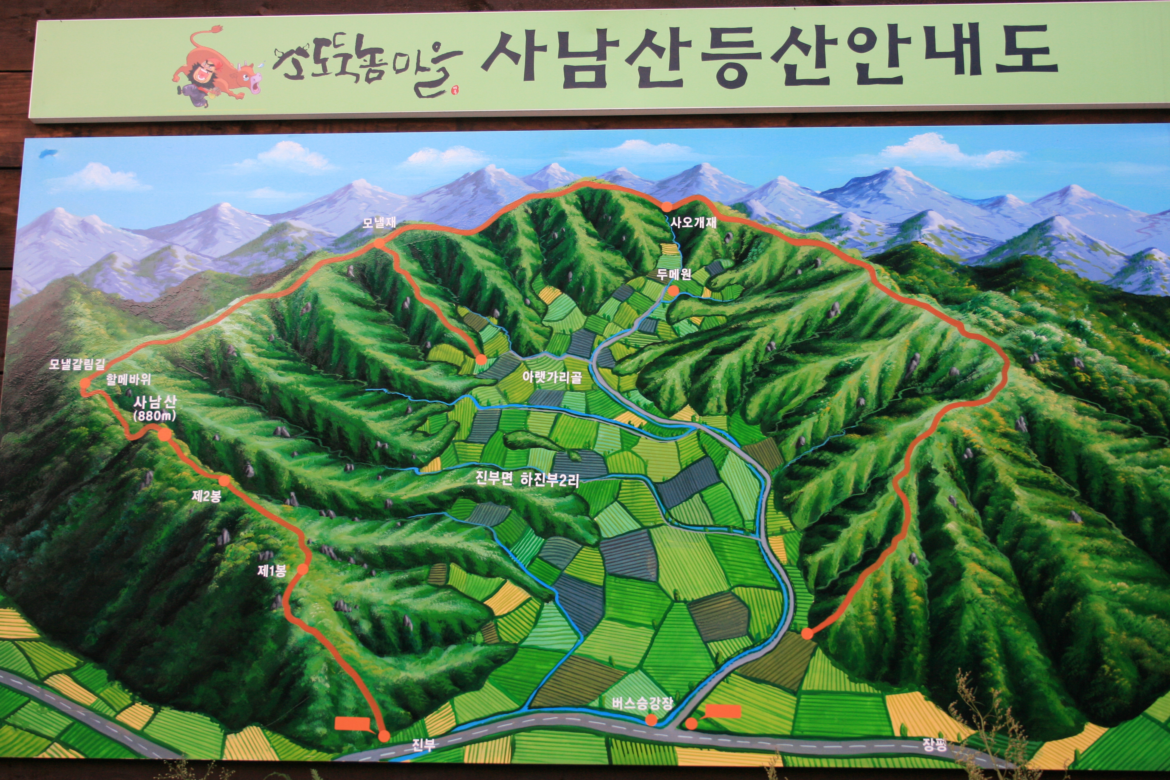 - 코스 : 사남산등로입구 ~ 제1봉 ~ 제2봉 ~ 사남산(880m) ~ 모낼갈림길 ~ 모낼재 ~아랫가리골 ~ 버스정류장 ~ 원점