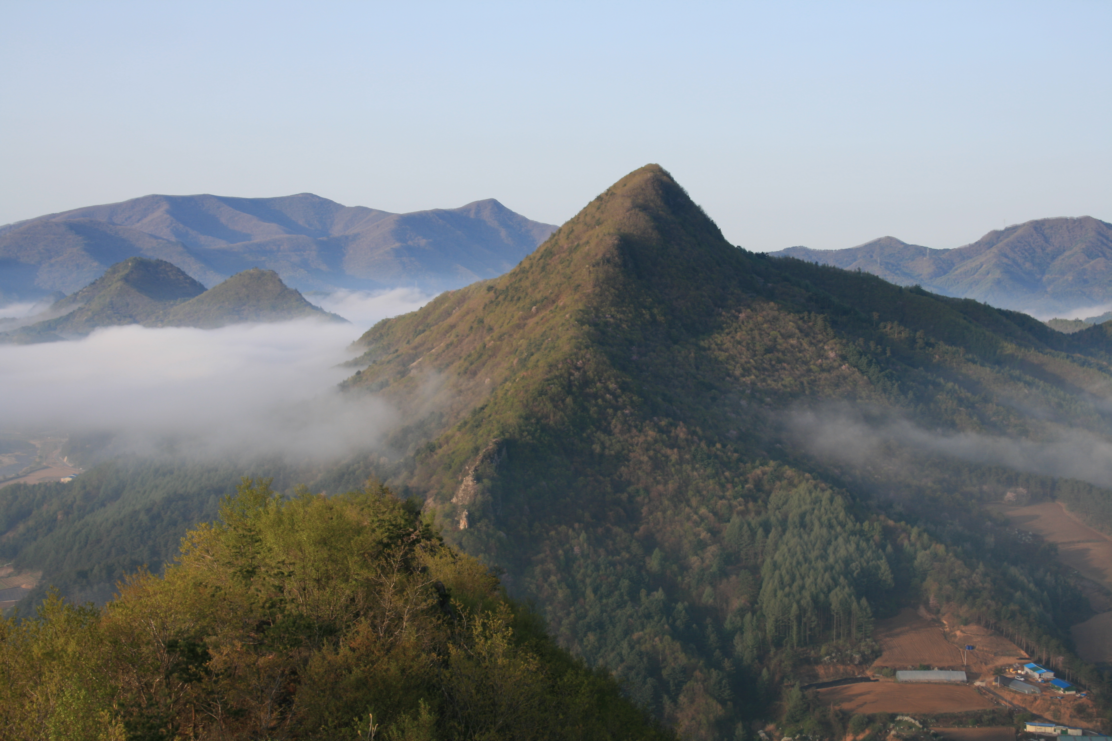 석두산에서 바라보이는 뽀족한 봉우리 "사남산"을 오늘아침 올랐다..