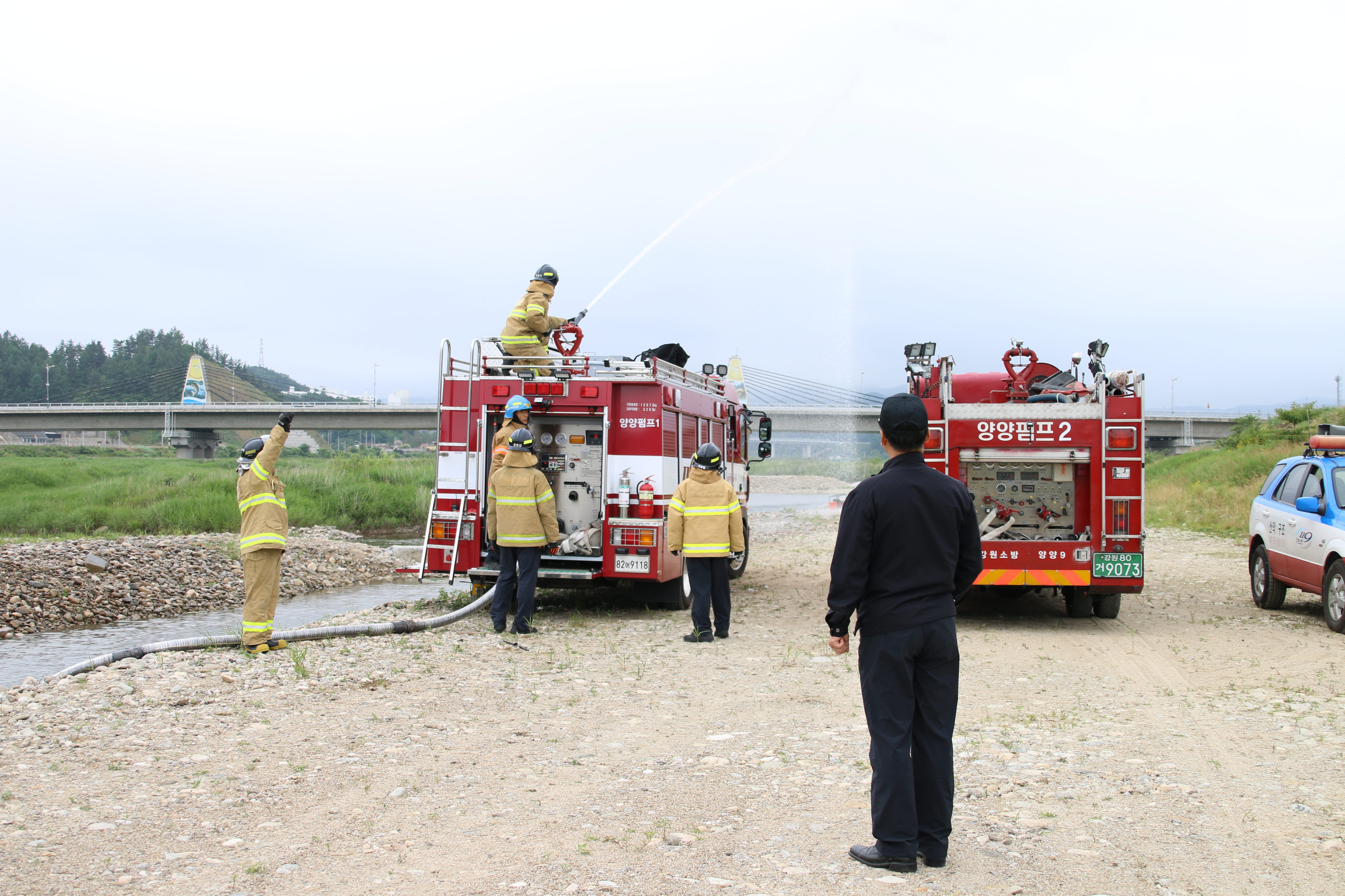 양양소방서(서장 이수남)는 13일 (월) 오후 13시 대형화재상황 대비 소방차량에 대한 장비조작훈련을 양양읍 둔치 일원에서 실시했다. 이날 훈련은 화재현장에서 대형화재상황과 소화전을 사용할 수 없는 상황을 가상하여 소방차량의 자체 진공펌프 기능을 이용, 강이나 웅덩이 등의 물을 흡수 후 방수하는 훈련을 실시했다.