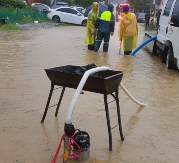 이날 오전 9시 10분경 남애리 소재 주택에 차도에서 빗물이 유입되면서 물이 차 수중펌프를 활용, 2시간 30동안 약 5톤가량의 배수 작업을 진행했다.