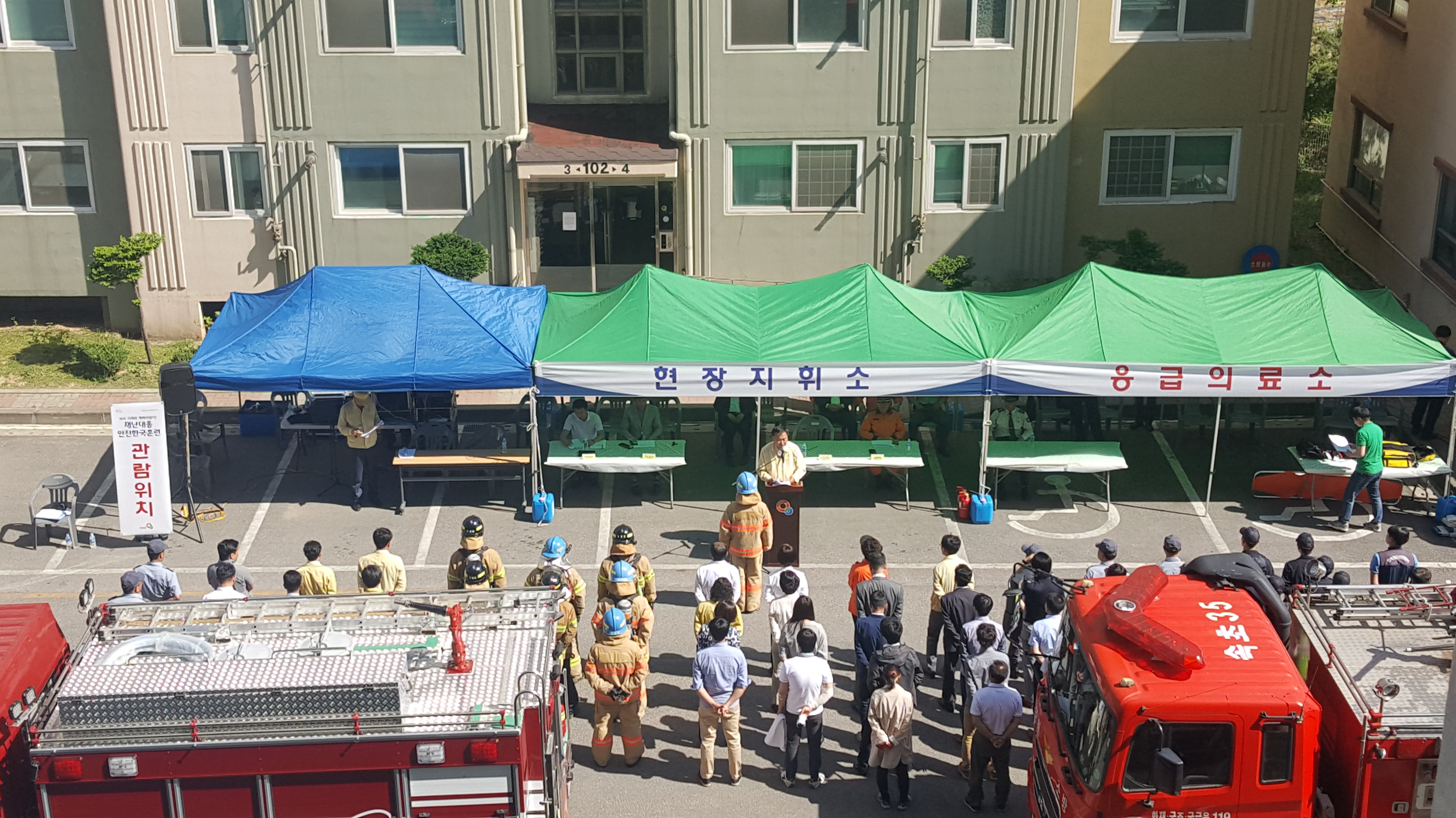 2016년 5월 19일,「재난대응 안전한국훈련」의 일환으로 하이팰리스아파트를 대상으로 실시한 다중밀집시설 대형화재 진압훈련 사진